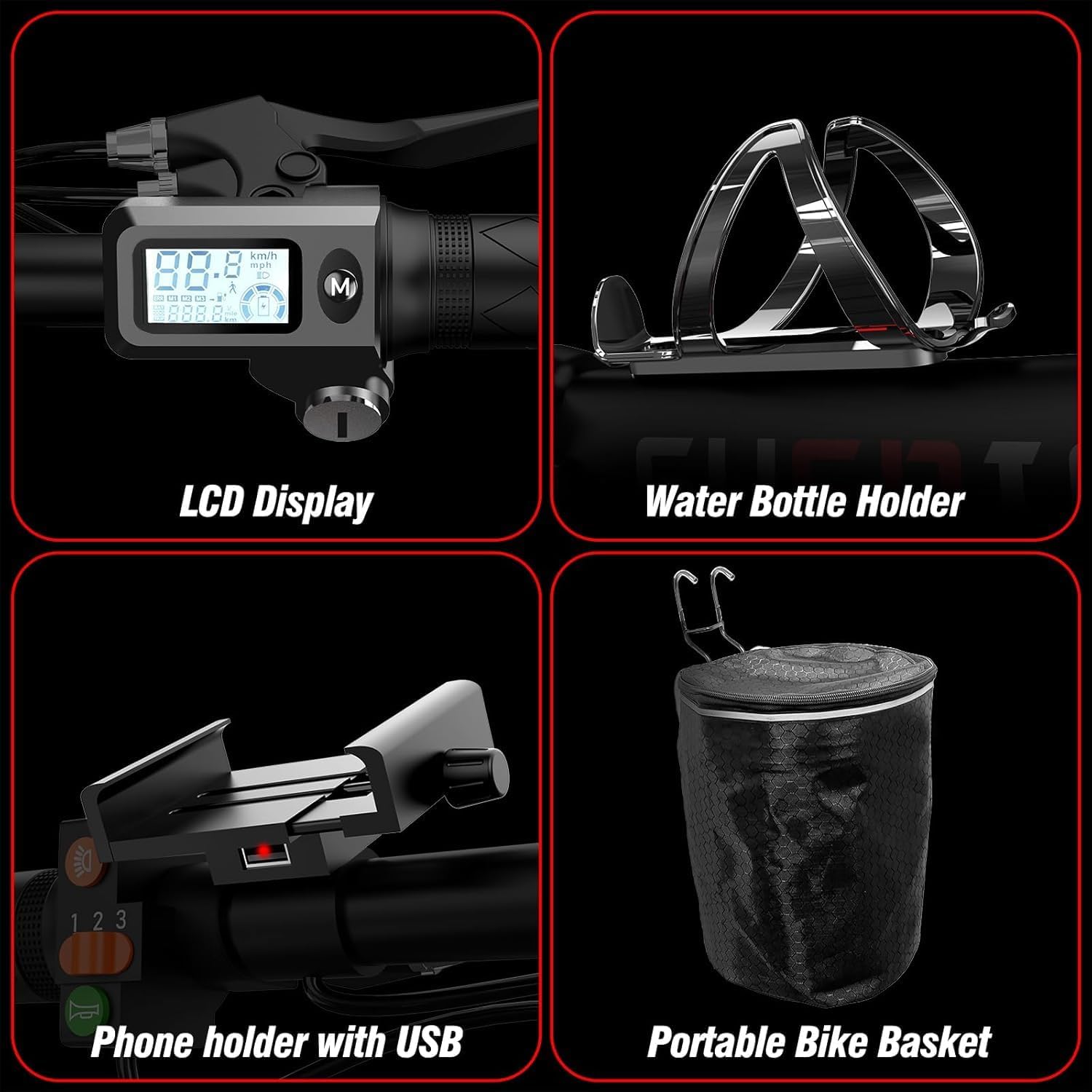- Safety, Control & Smooth Ride: For maximum safety, the e-bike comes with fast dual front and rear mechanical disc brakes, an LCD display, adjustable handlebars and saddle, front and rear lighting, and a convenient phone charging holder. Enjoy a safe, comfortable ride every time.