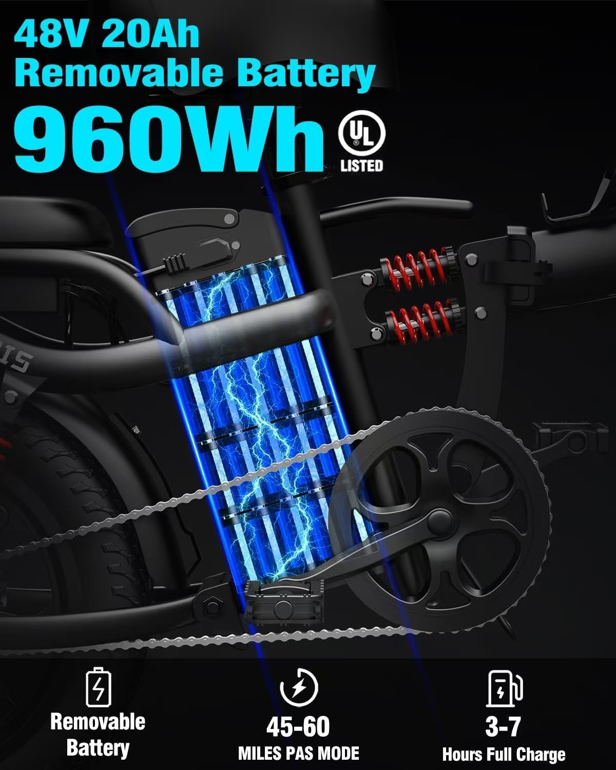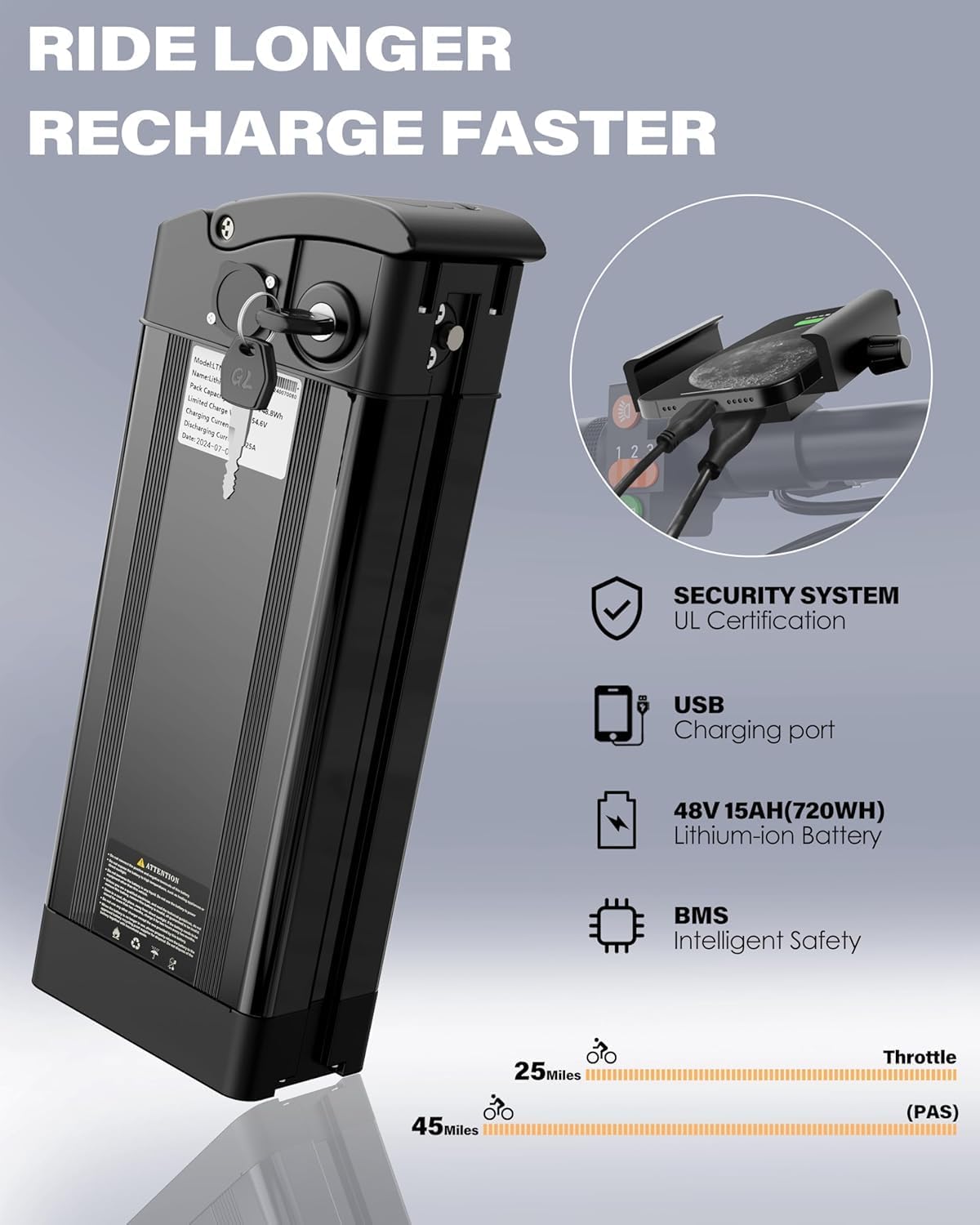 - Certified 48V 15Ah Lithium Battery: Equipped with a UL 2849 certified 48V 15Ah removable battery, this e-bike provides up to 25 miles in electric-only mode and 45 miles with pedal assist. Get the performance and range you need for your daily rides.