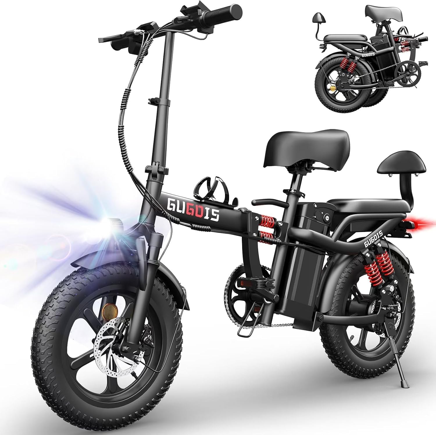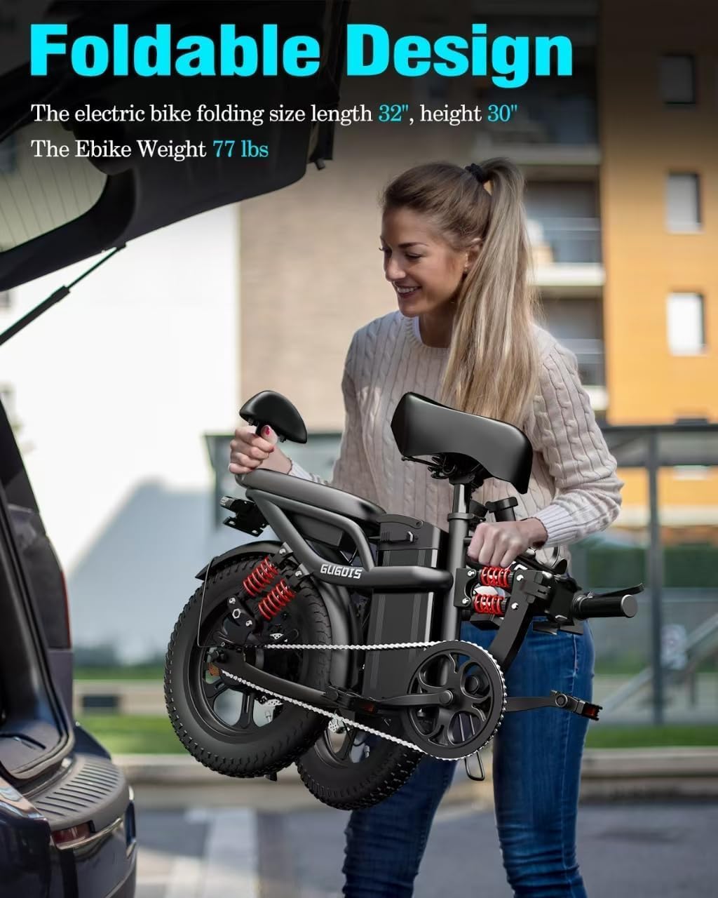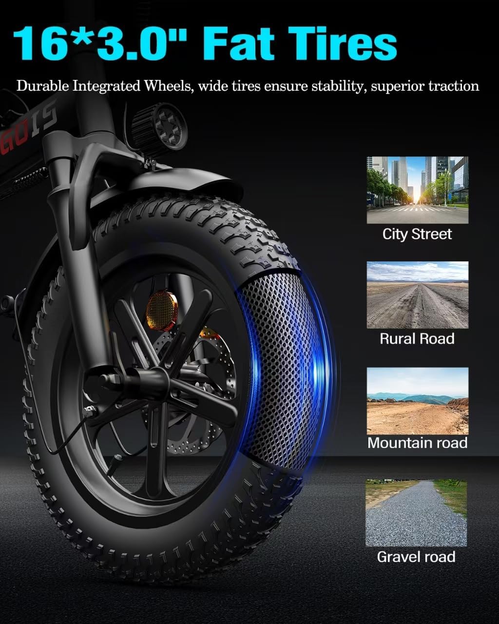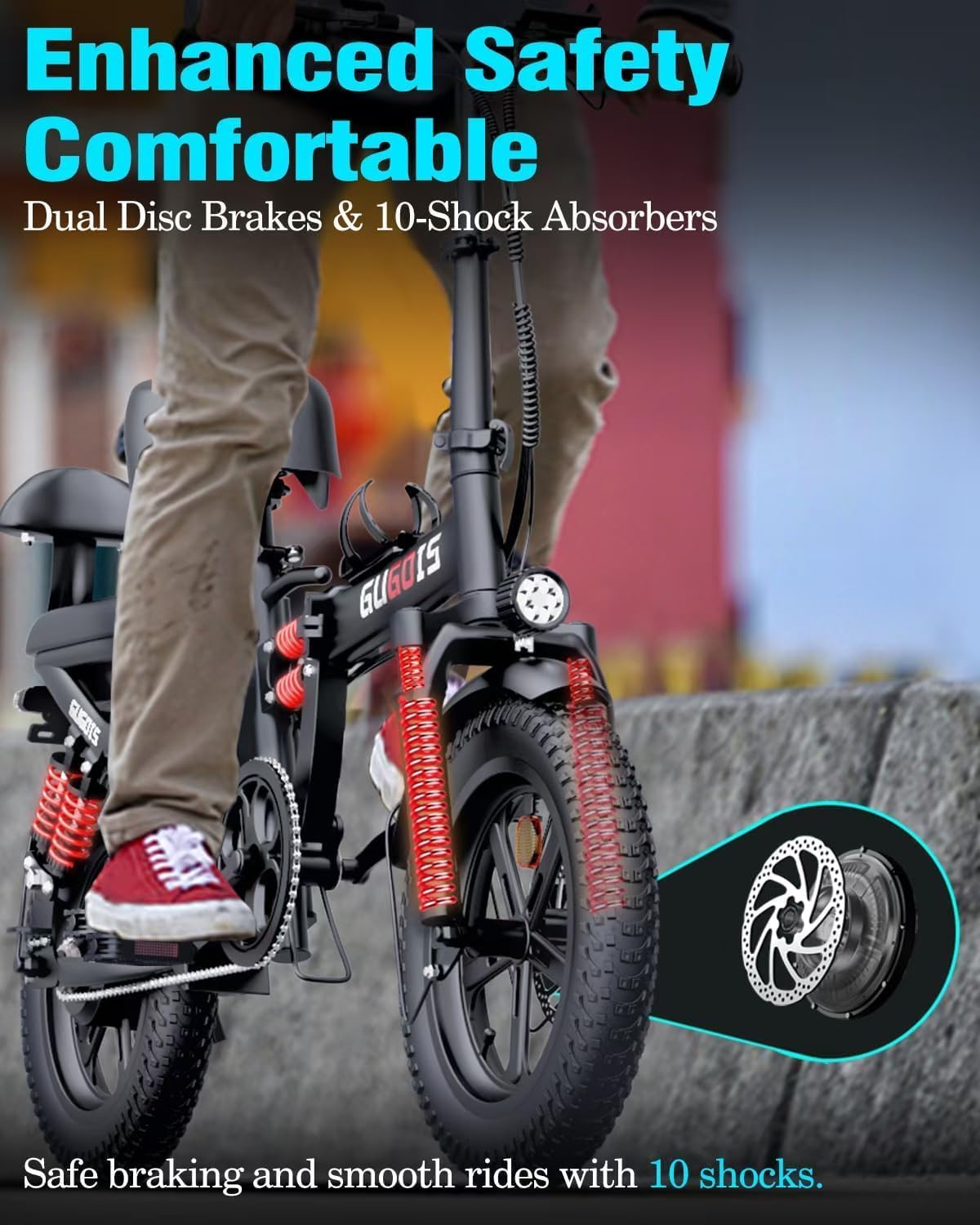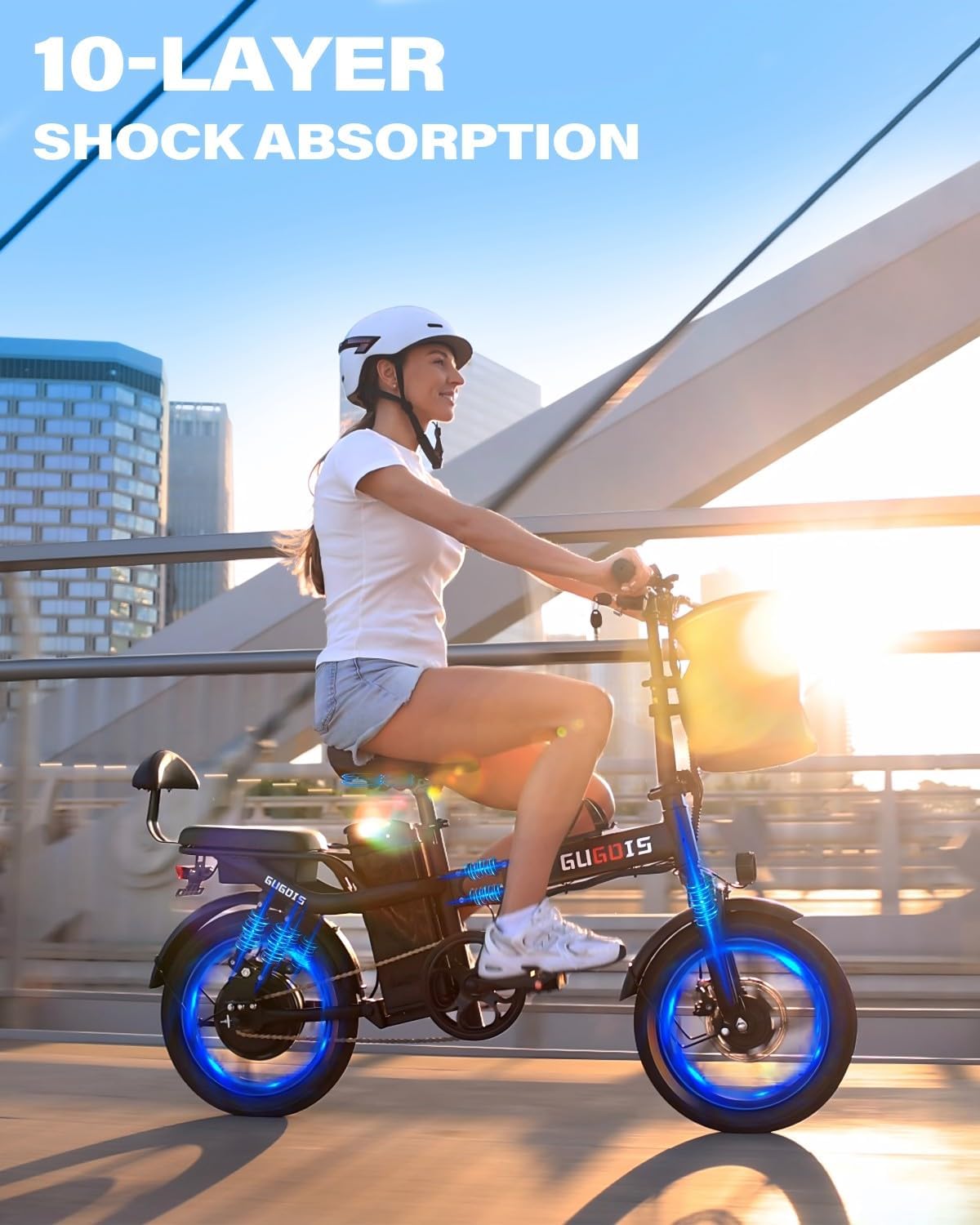 - Comfortable & Versatile Riding: This folding electric bike is equipped with 10 shock absorbers and 16-inch aluminum alloy integrated wheels, providing superior shock absorption for a smooth, stable ride on any terrain__rom city streets to rugged paths.