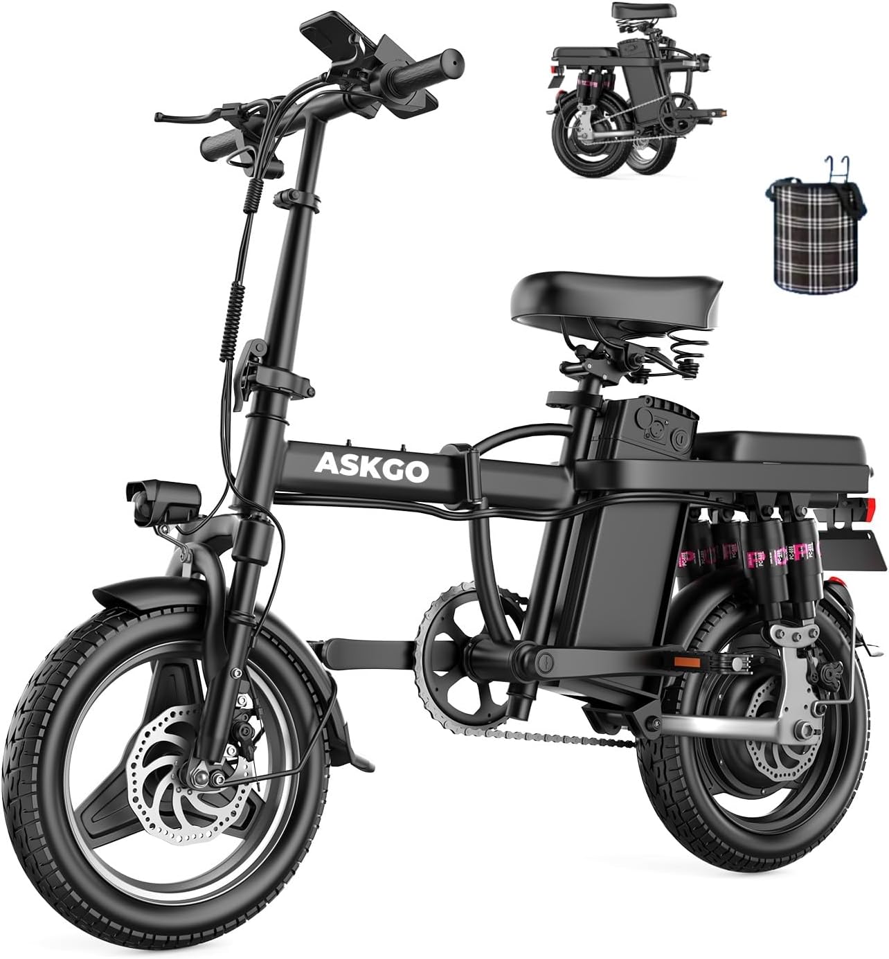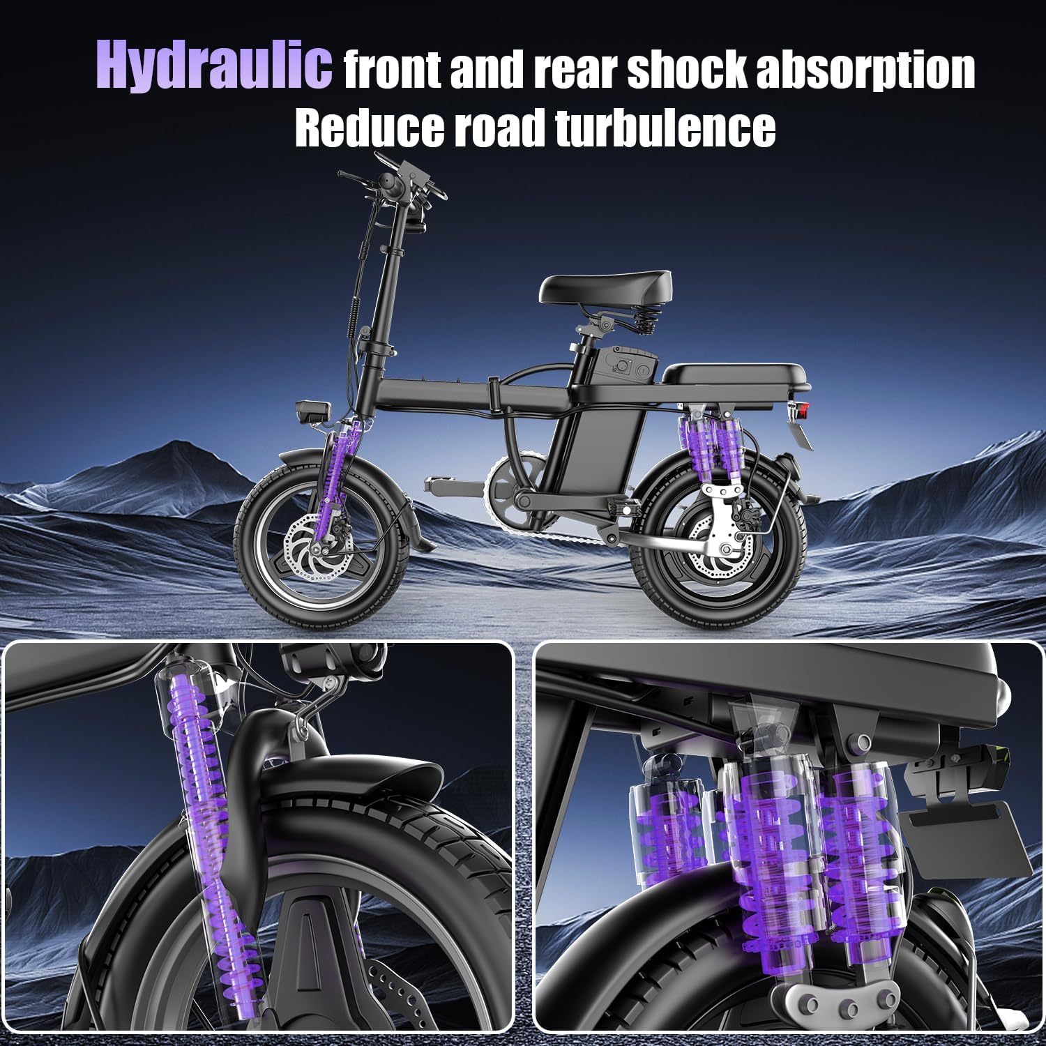 - __ull Shock Absorption System_- Askgo F12 e bike adopts front fork shock absorption, middle shock absorber, rear shock absorber, cushion type dual spring shock absorption four shock absorption area design, do not need to worry about the bumpy road surface. The interaction of shock absorbers reduces physical discomfort while riding, allowing you to ride comfortably in the city.