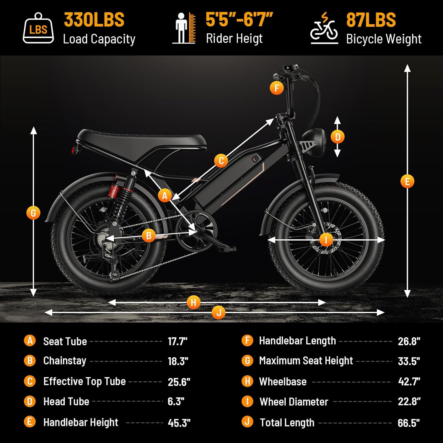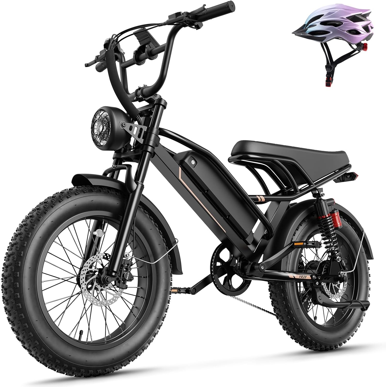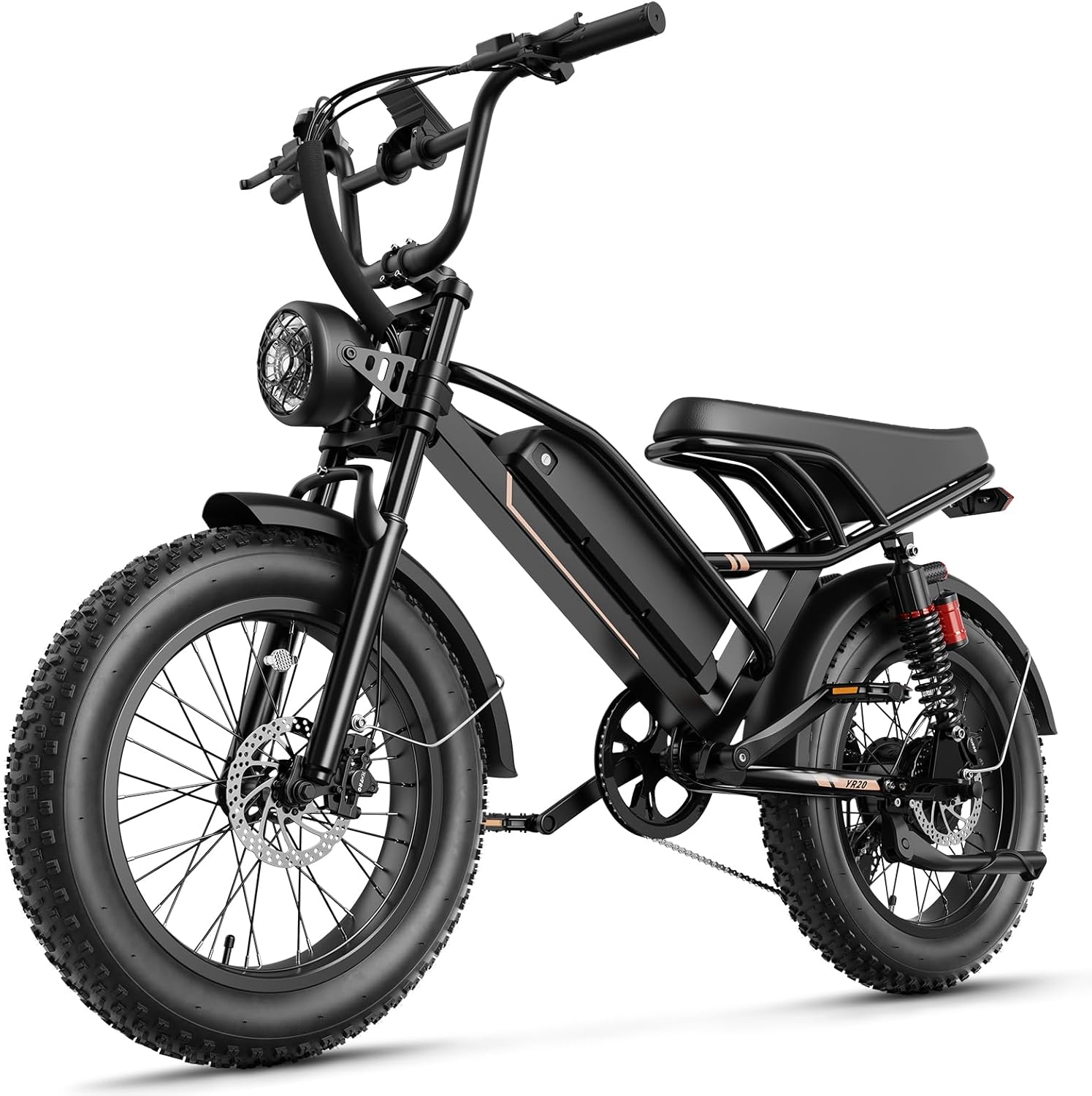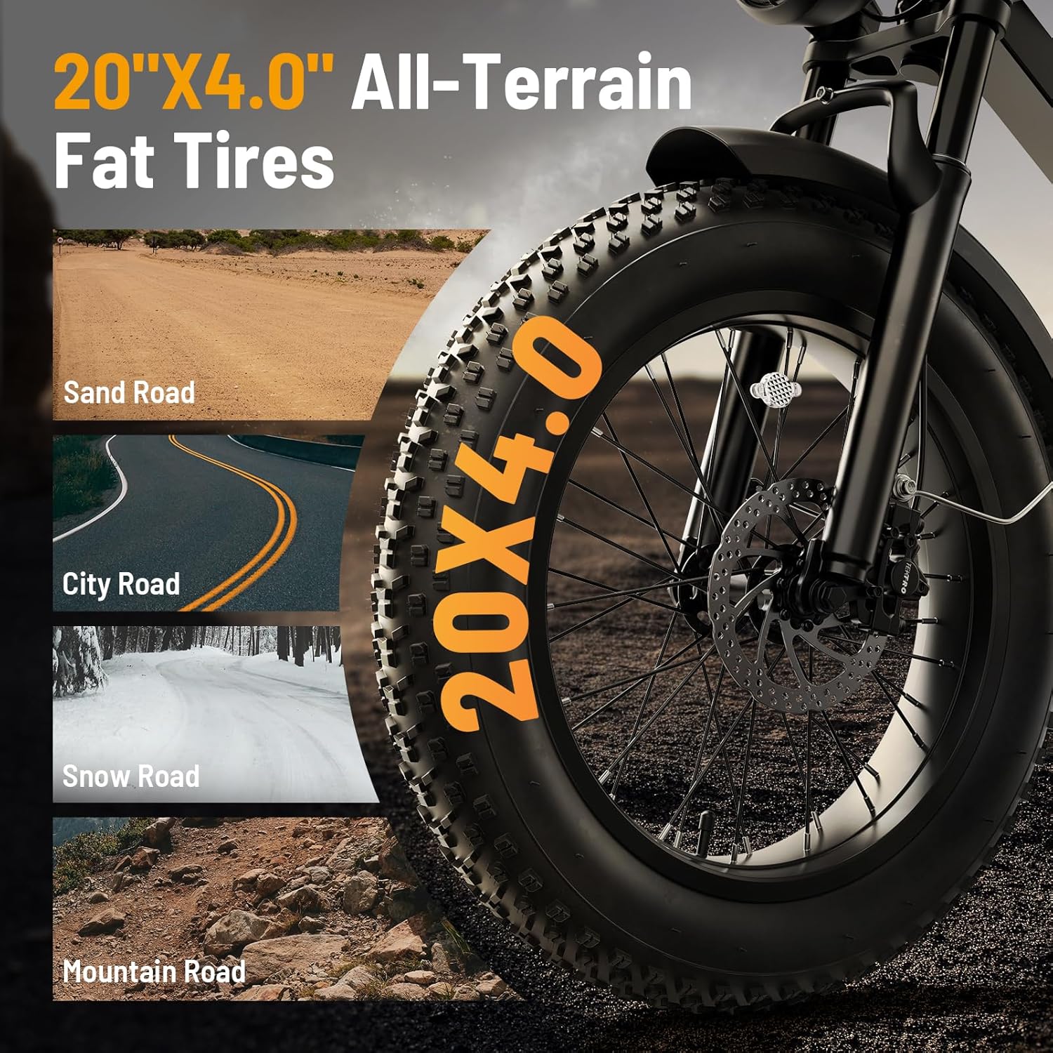 - Multiple Shock Absorption for More Comfort: The dual suspension system, featuring a front fork and rear shock absorbers, combined with 20''_4'' wide fat tires, offers unmatched comfort and superior handling. The YR20 dirt bike effectively absorbs bumps and shocks, ensuring a smooth, stable ride across rough trails, urban streets, sandy shores, snowy landscapes, and more. Enjoy exceptional control and a more enjoyable, effortless ride on any surface
