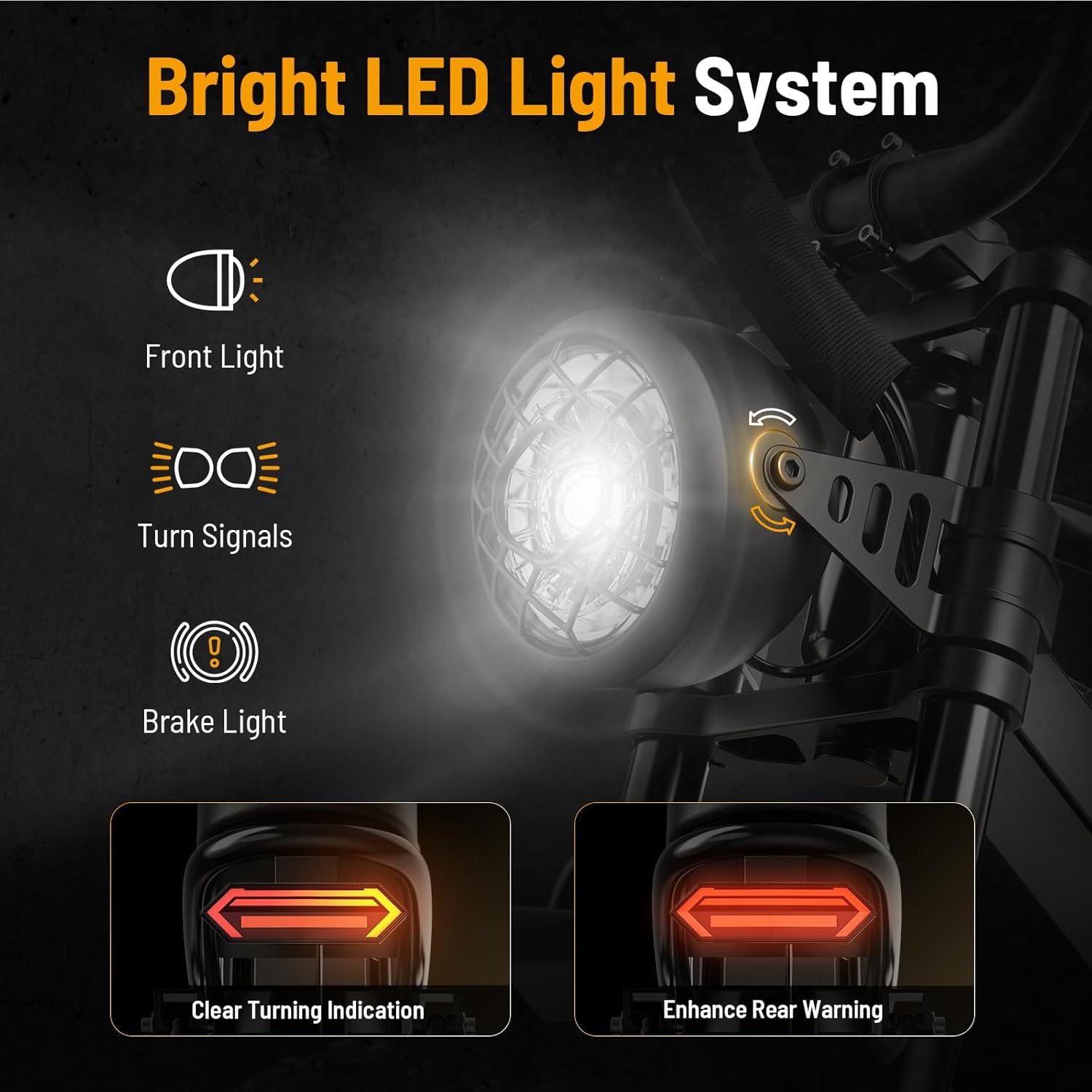 - Hydraulic Brakes & Full Lighting System: Featuring precision hydraulic disc brakes, the YR20 ebike provides outstanding stopping power for enhanced safety. The comprehensive lighting system, including front light, brake light, and turning lights, ensures you're well-lit and visible in all riding environments, day or night