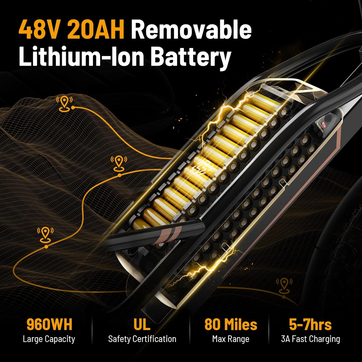 - High-Capacity 48V 20Ah Battery for Extended Range: With a removable 48V 20Ah battery, you could enjoy up to 80 miles of riding on a single charge in PAS mode, allowing for longer adventures without the need for frequent recharges. The 3A fast charger ensures a quick recharge in just 5-7 hours, so you could spend more time exploring and less time waiting to recharge