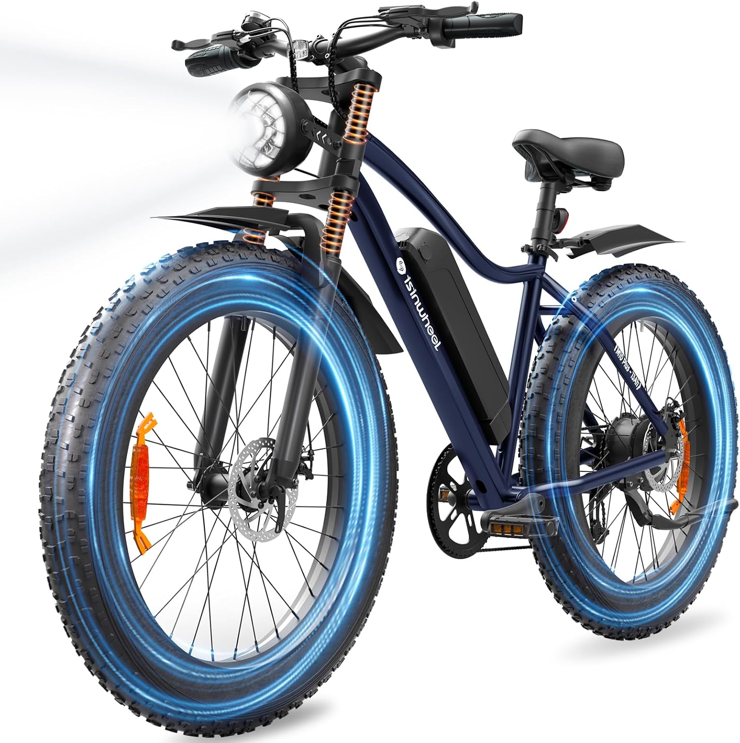 - __mooth Ride_- Enjoy a silky-smooth ride with our fat tire electric bike. Front and rear suspension effortlessly absorb bumps and rough terrain. Glide over city potholes or uneven country roads, feeling the comfort of the soft, wide saddle. Whether commuting daily or adventuring on weekends, this electric mountain bike guarantees a cushioned, enjoyable ride