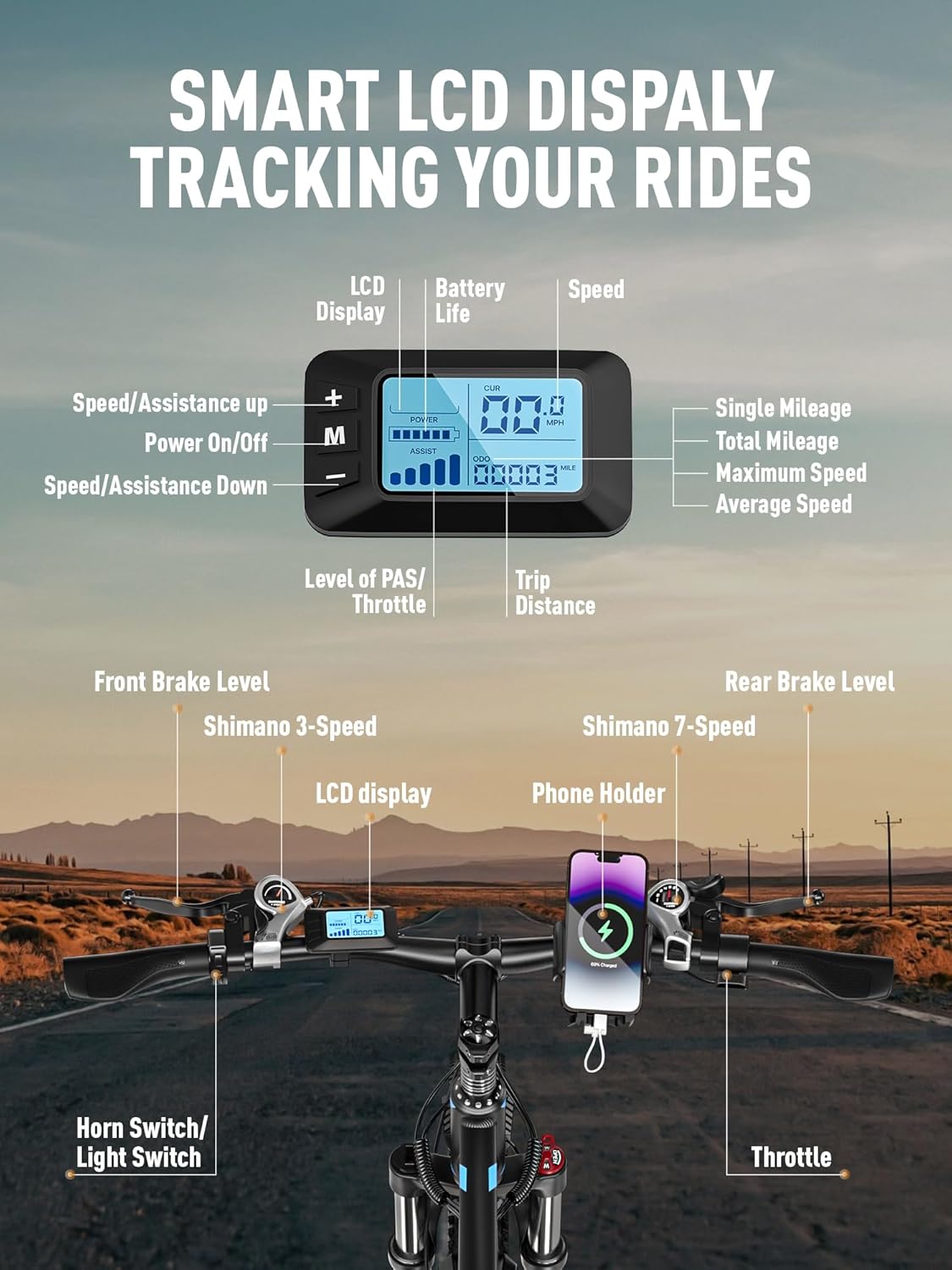 - _5 Working Modes & Intuitive LCD Display__his mountain e-bike comes with 5 riding modes to suit your needs. __alk Mode: Push the bike gently; _PAS Mode: Get 5 levels of assistance; _Cruise Mode: Maintain a steady speed without throttle or pedaling; _Manual Mode: Shift gears based on riding conditions; _Bike Mode: Use it as a regular fitness bike. Speed, assistance level, battery life, trip distance, and all useful info are displayed on the smart LCD screen.
