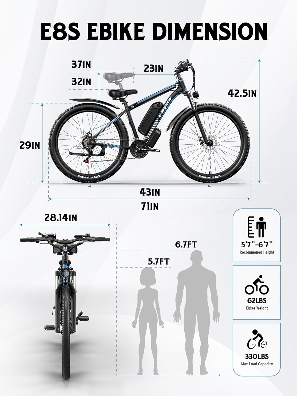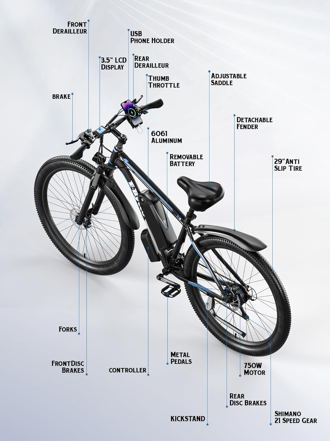 - __rofessional Hybrid Bike & High Material__quipped with a 21-speed gear kit, reliable dual disc brakes, a lightweight aluminum frame, and a powerful 1000W peak motor, this bike allows you to tackle hills with ease and safety. The 29' x 2.1' large tires and lockable suspension fork make it perfect for both urban and off-road riders. Use it for your daily commute, travels, or long trips!