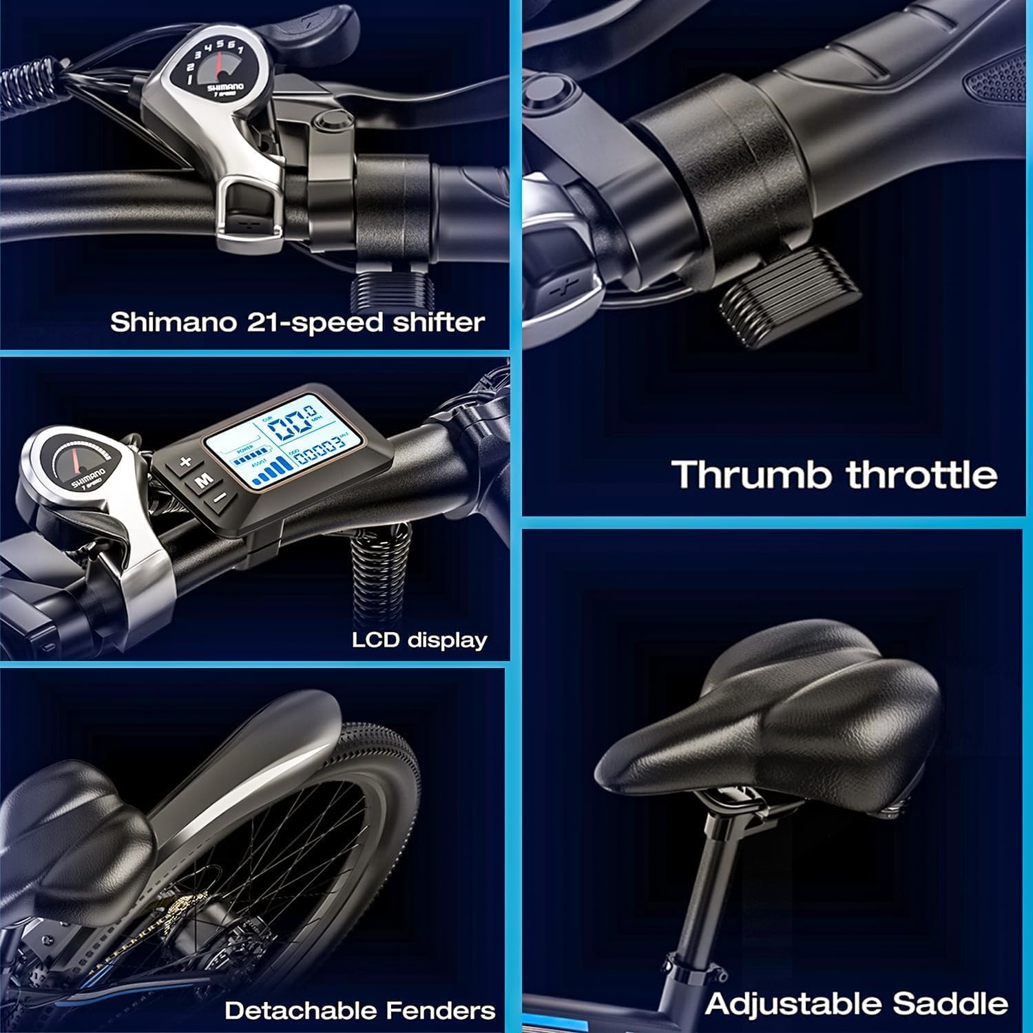 - __leek Design & Top-Notch Accessories Equipped__his electric road bike boasts a sleek and stylish look, complete with a headlight, taillight, horn, mudguards, rear rack, phone holder with USB charging port, smart LCD display, metal pedals, adjustable saddle, and sturdy kickstand. Its ergonomic design ensures a safe and comfortable ride.
