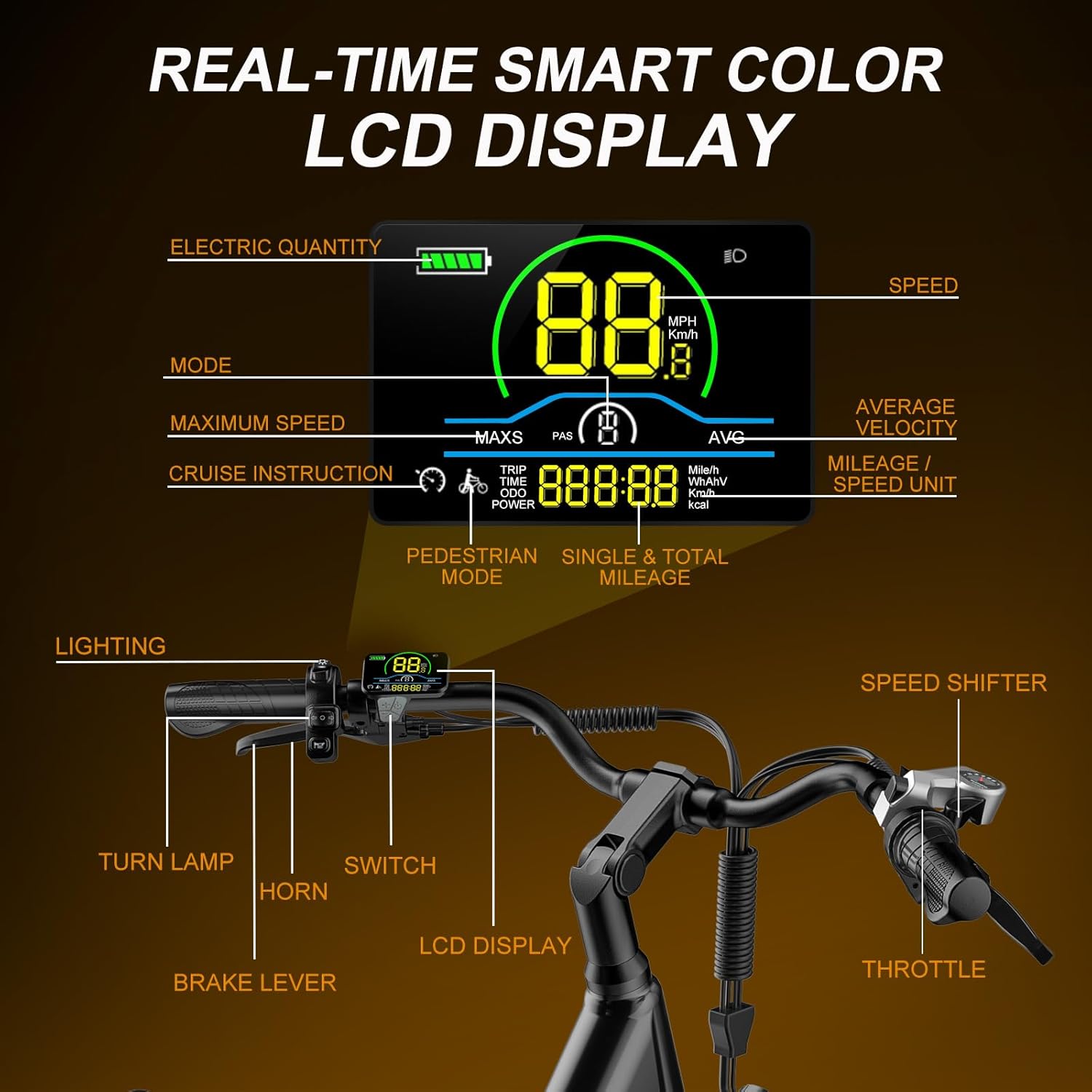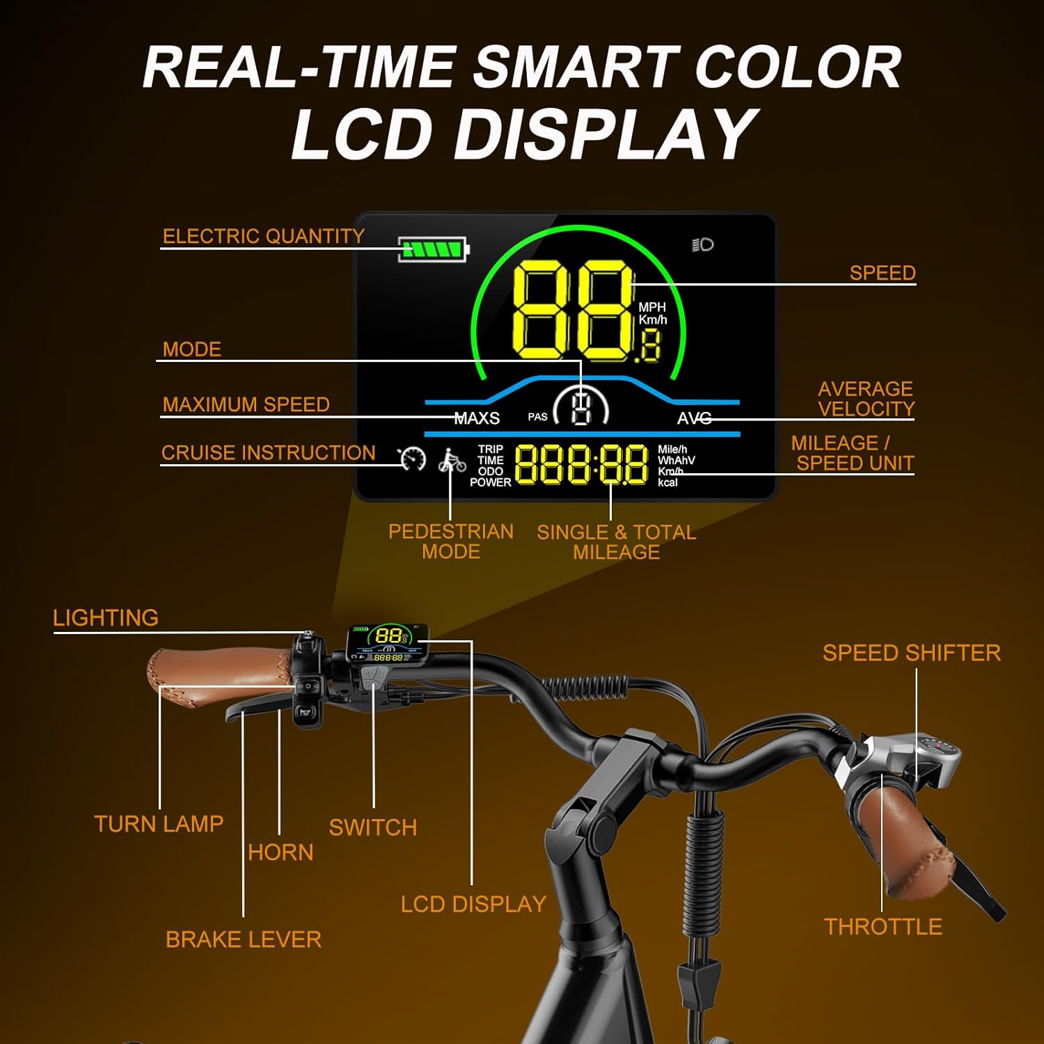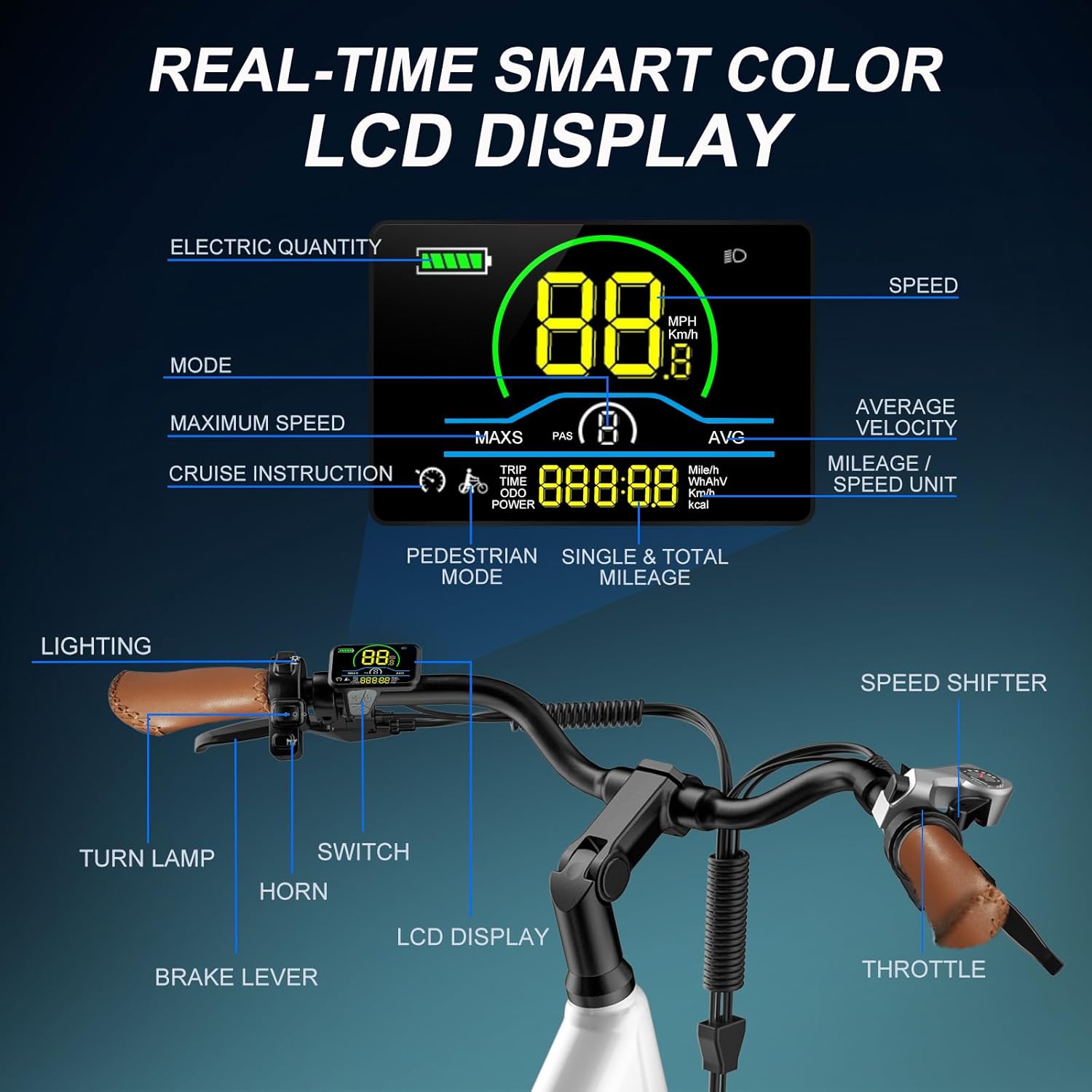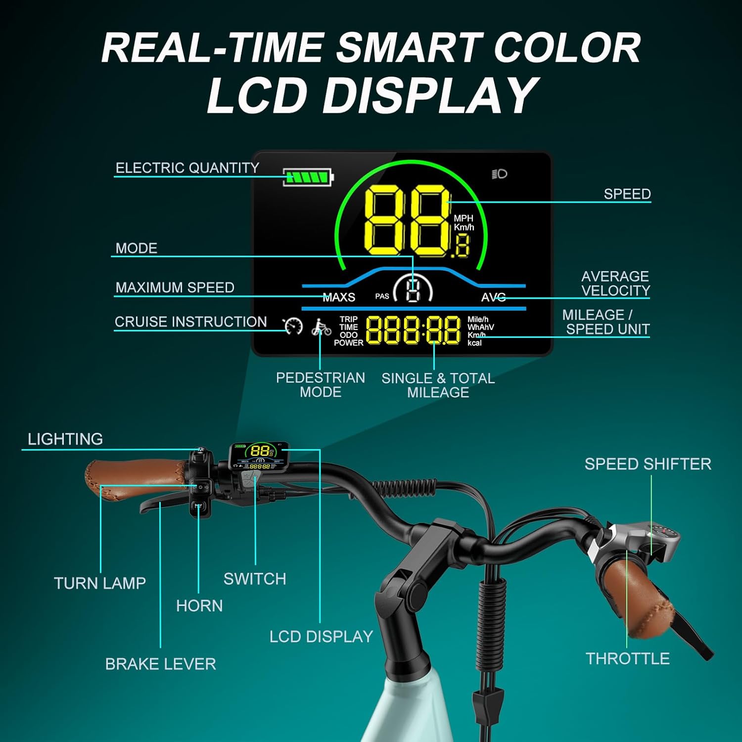 - _4 Riding Modes & 7 Speed Gearing__bike provides 4 modes to ride, pure electric, PAS, cruise and bike. Professional 7-speed gear shifter allows you to change the gears for adapting to different terrains, multi-function LCD display, which can easily track the riding data, such as current speed, single ride mileage, total ride mileage, battery level, etc.. You can also adjust 4 riding modes for personalized settings to meet the riding needs in different scenarios.