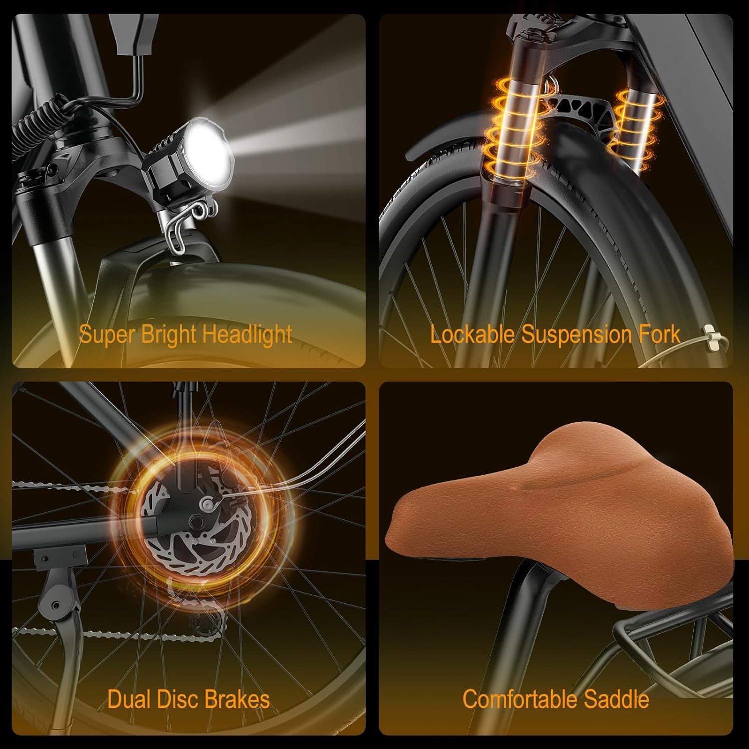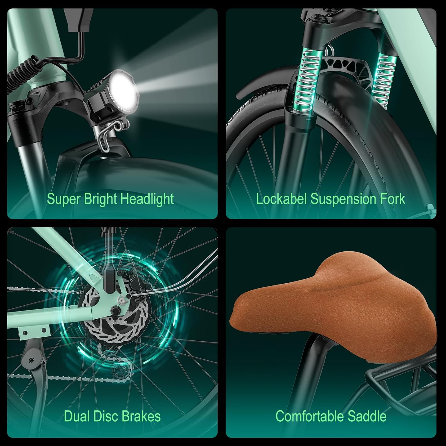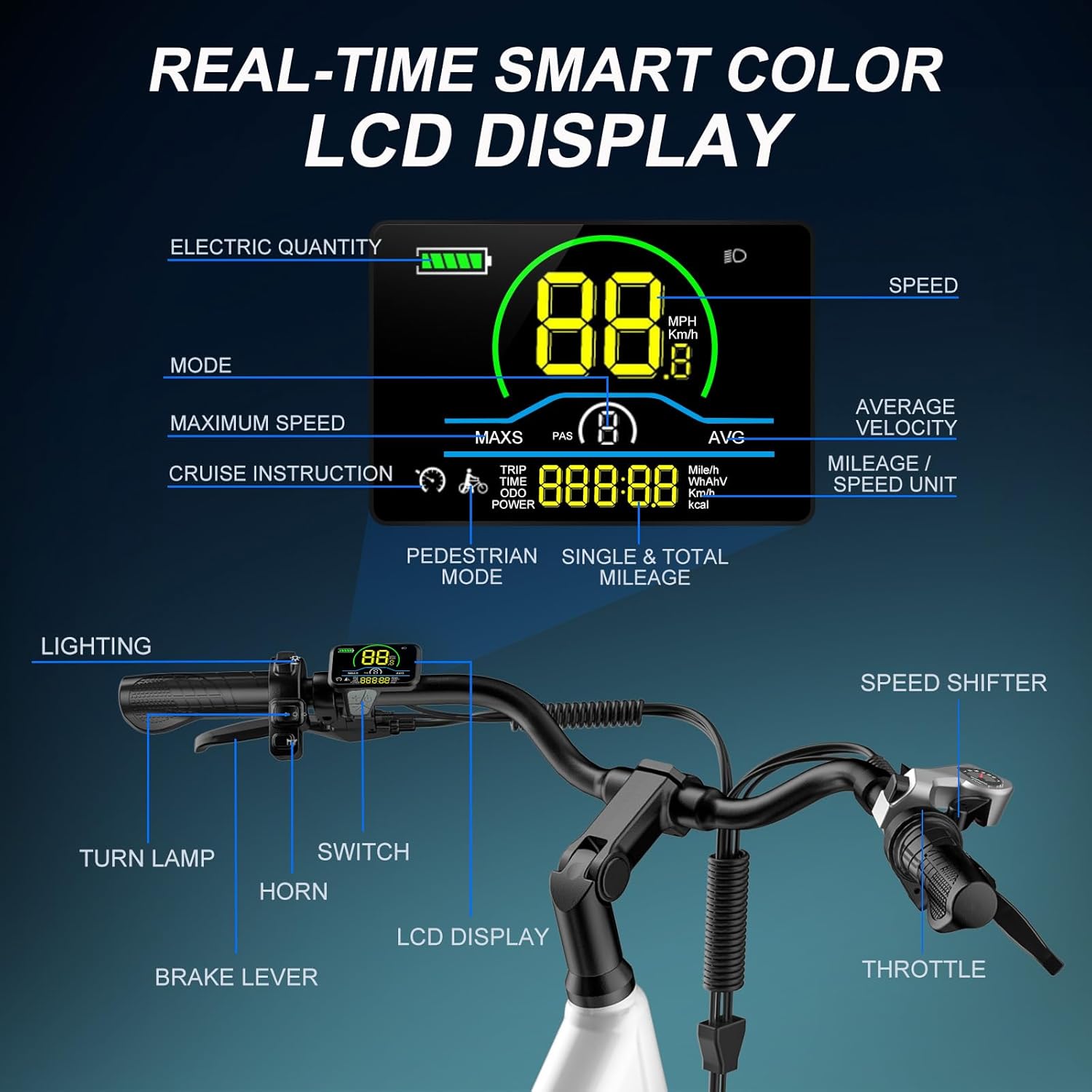 - _4 Riding Modes & 7 Speed Gearing__bike provides 4 modes to ride, pure electric, PAS, cruise and bike. Professional 7-speed gear shifter allows you to change the gears for adapting to different terrains, multi-function LCD display, which can easily track the riding data, such as current speed, single ride mileage, total ride mileage, battery level, etc.. You can also adjust 4 riding modes for personalized settings to meet the riding needs in different scenarios.
