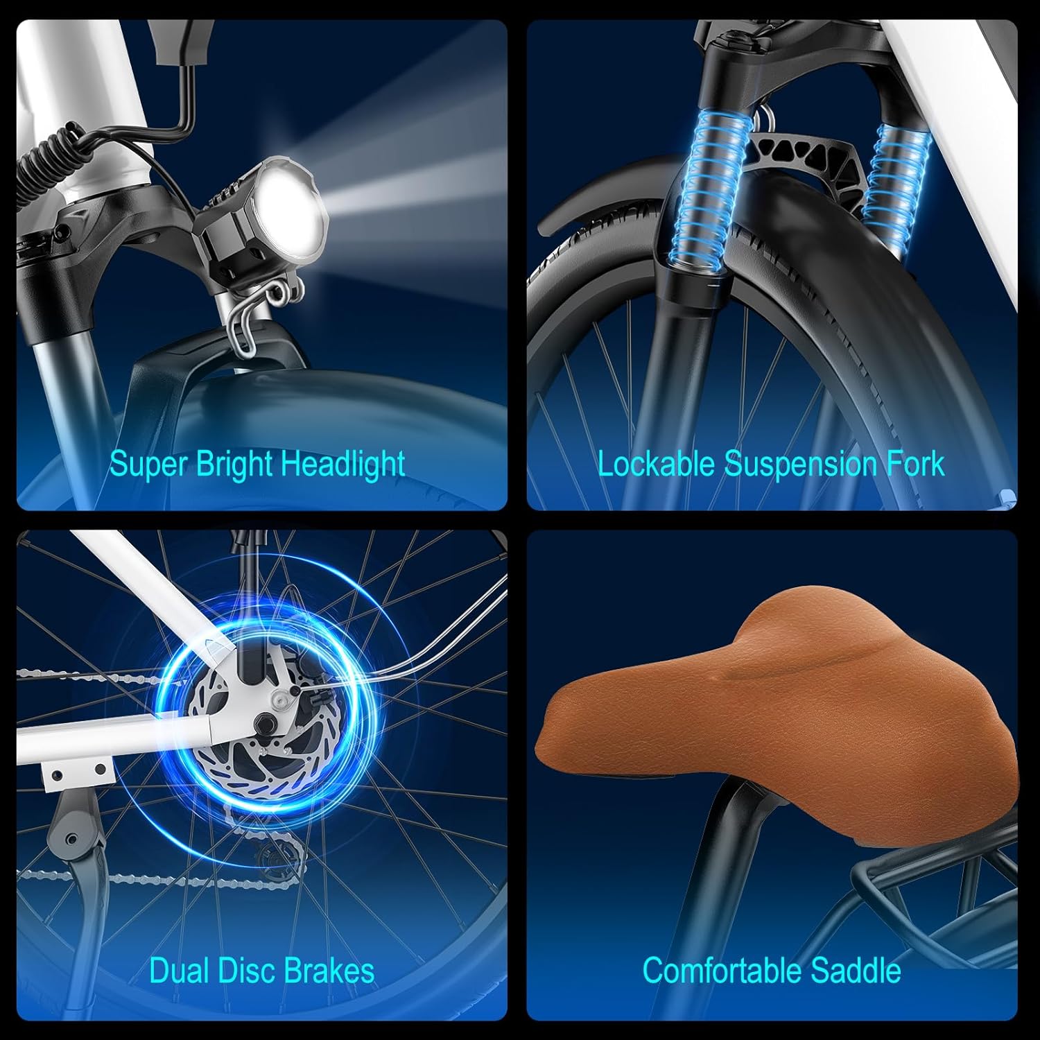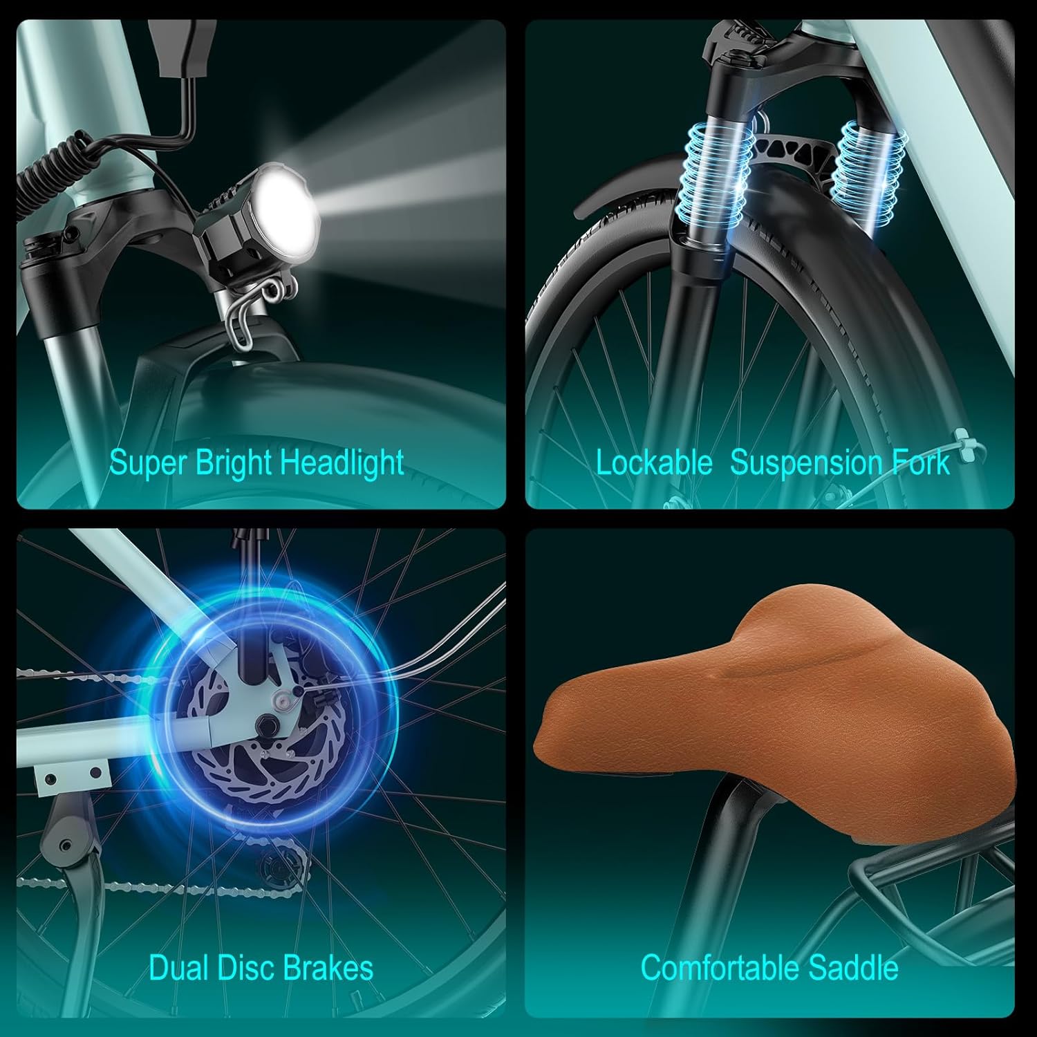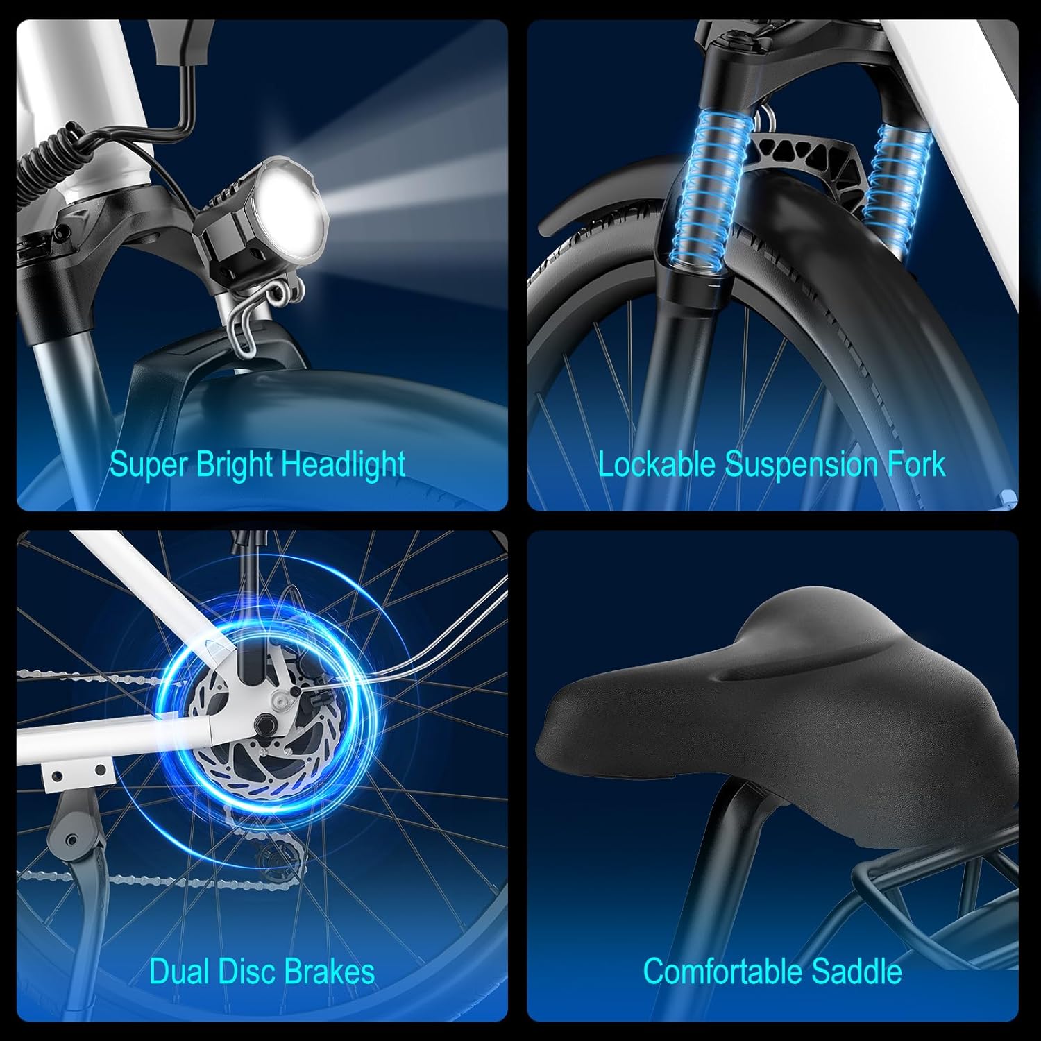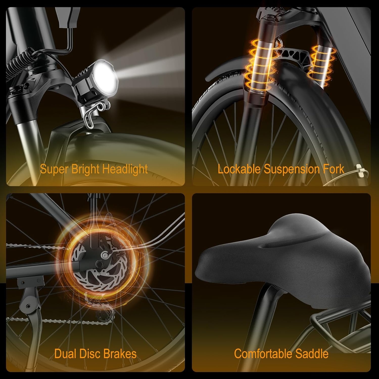 - _4 Riding Modes & 7 Speed Gearing__bike provides 4 modes to ride, pure electric, PAS, cruise and bike. Professional 7-speed gear shifter allows you to change the gears for adapting to different terrains, multi-function LCD display, which can easily track the riding data, such as current speed, single ride mileage, total ride mileage, battery level, etc.. You can also adjust 4 riding modes for personalized settings to meet the riding needs in different scenarios.