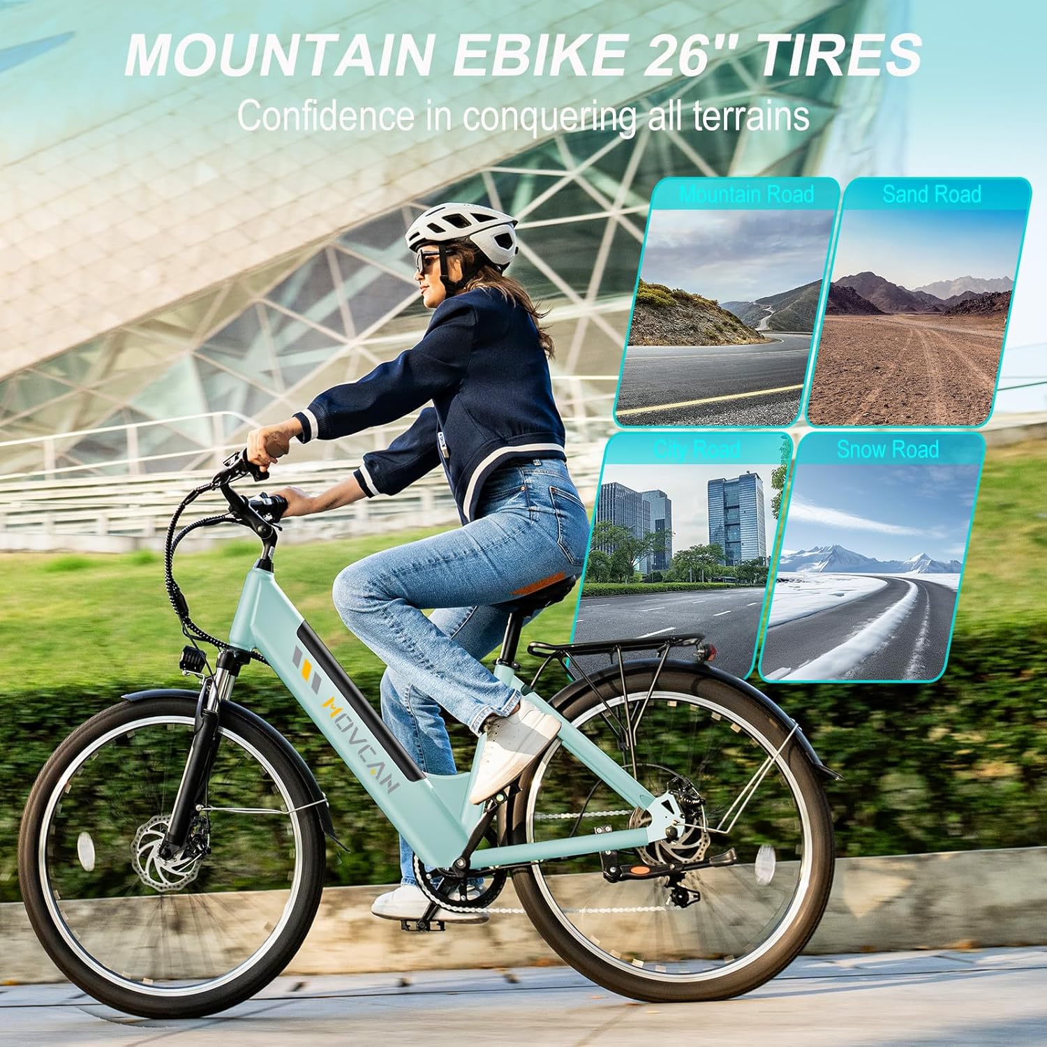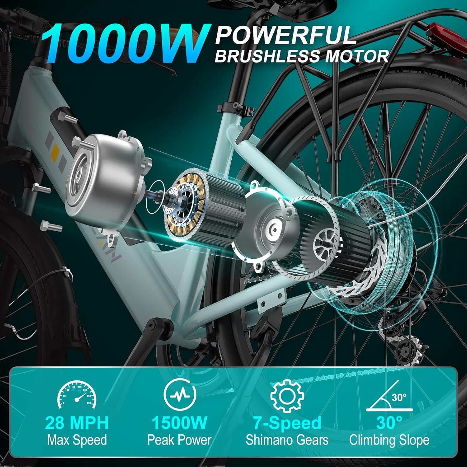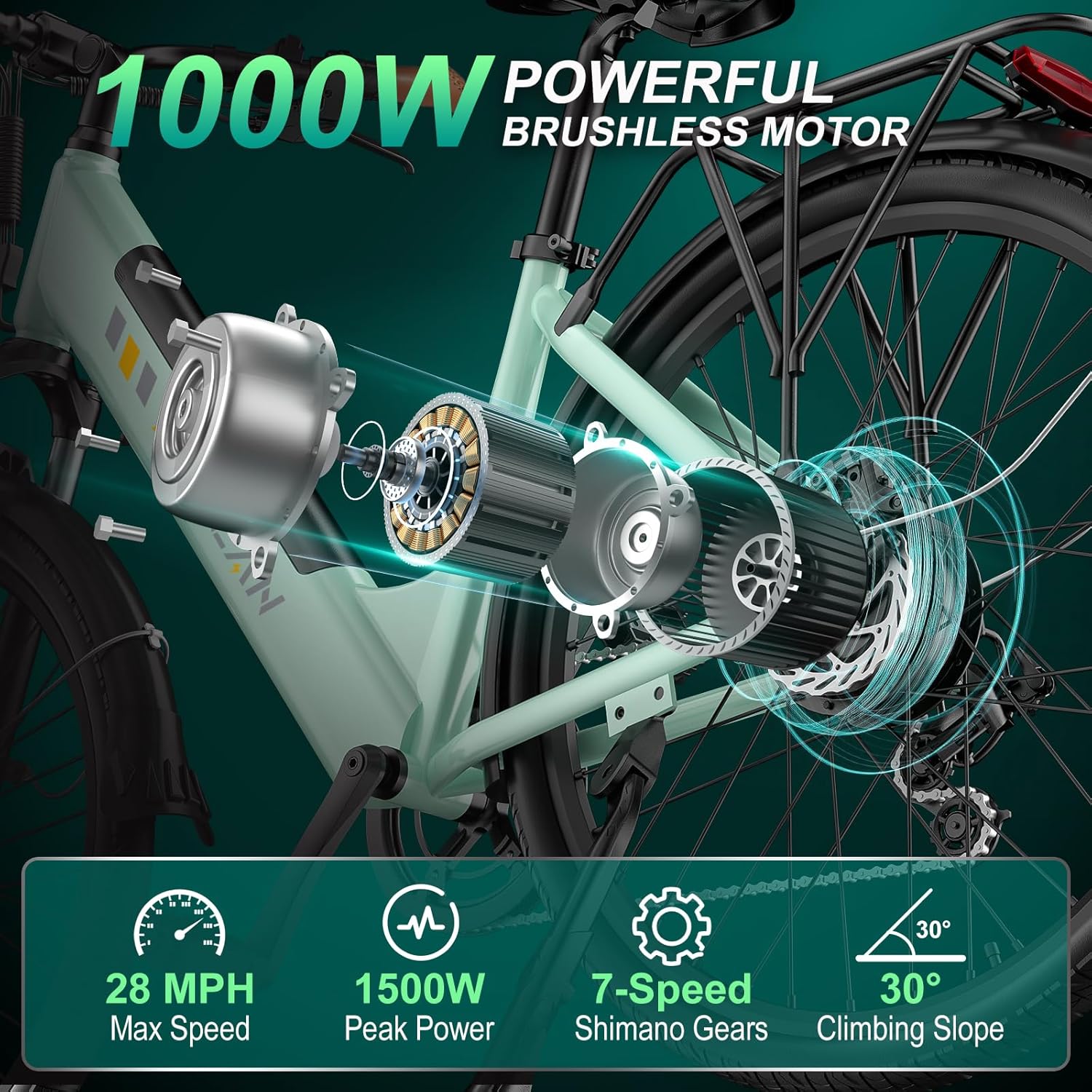 - __owerful 1000W Motor__ovcan V80 electric bike Built-in a 1000W�_eak 1500W�_rushless hub motor, electric bike for adults can reach a top speed of 28MPH, robust motor delivering 80N.M torque, easily overcome 30° steep hills. You can enjoy a comfortable riding experience and powerful braking even on steep slopes, rugged terrain, or other extreme terrains.