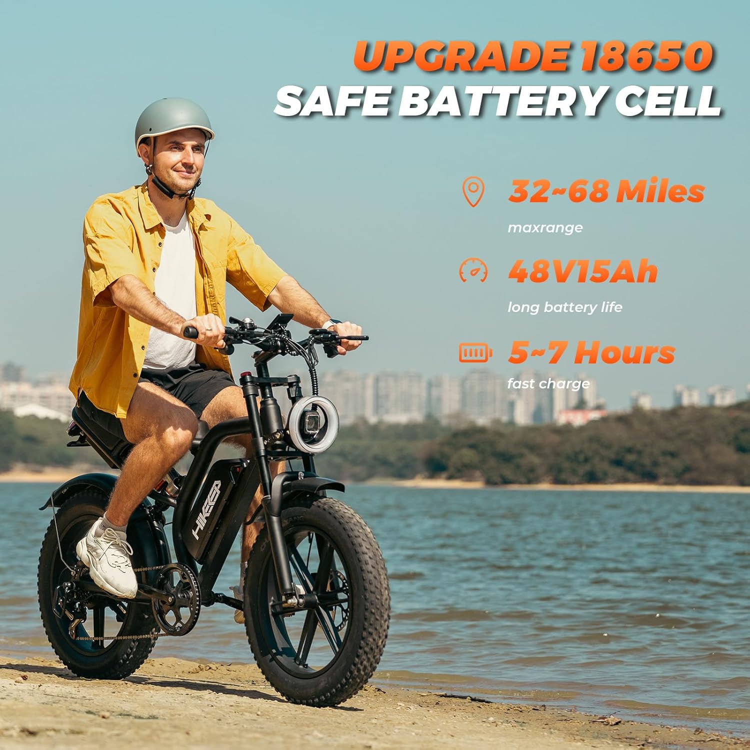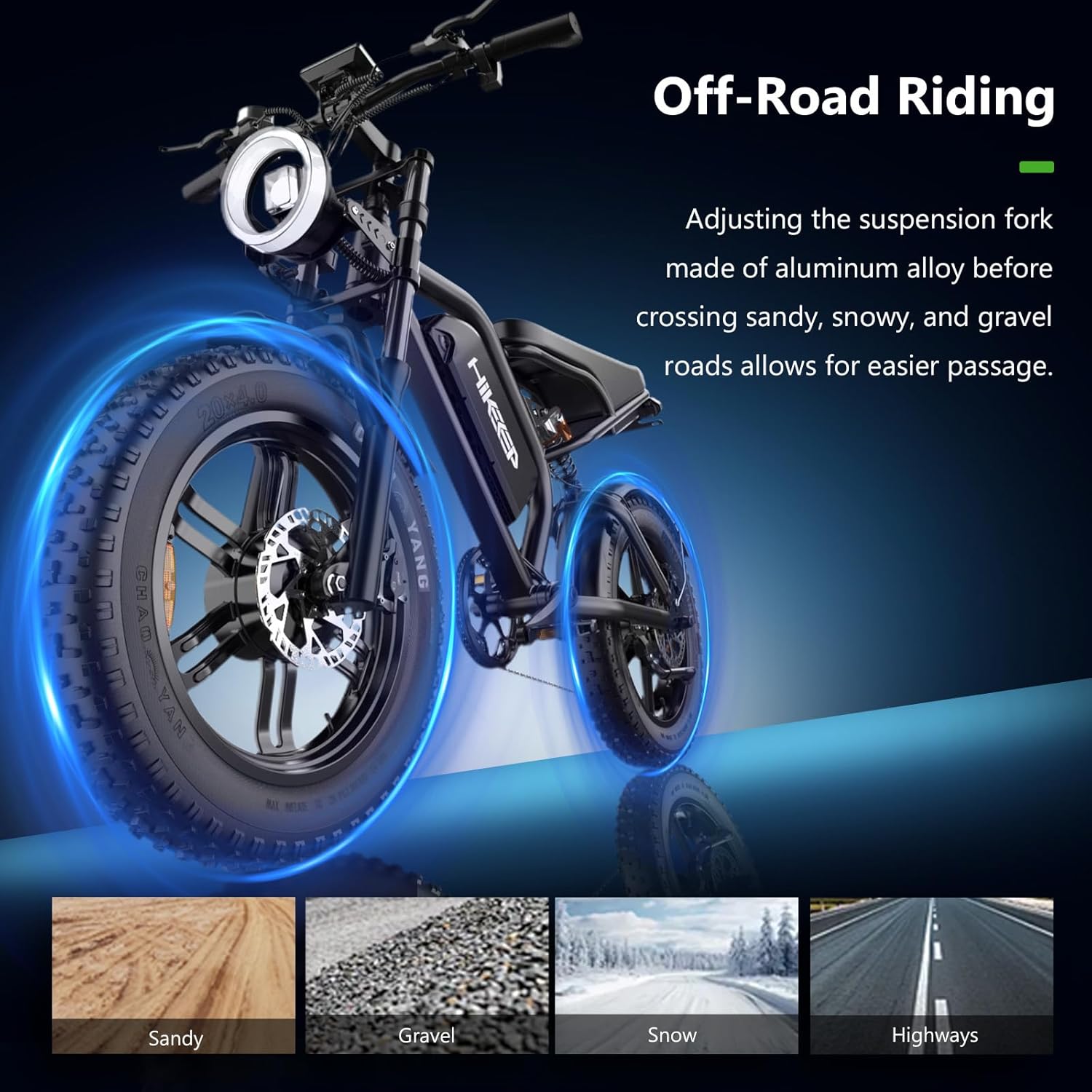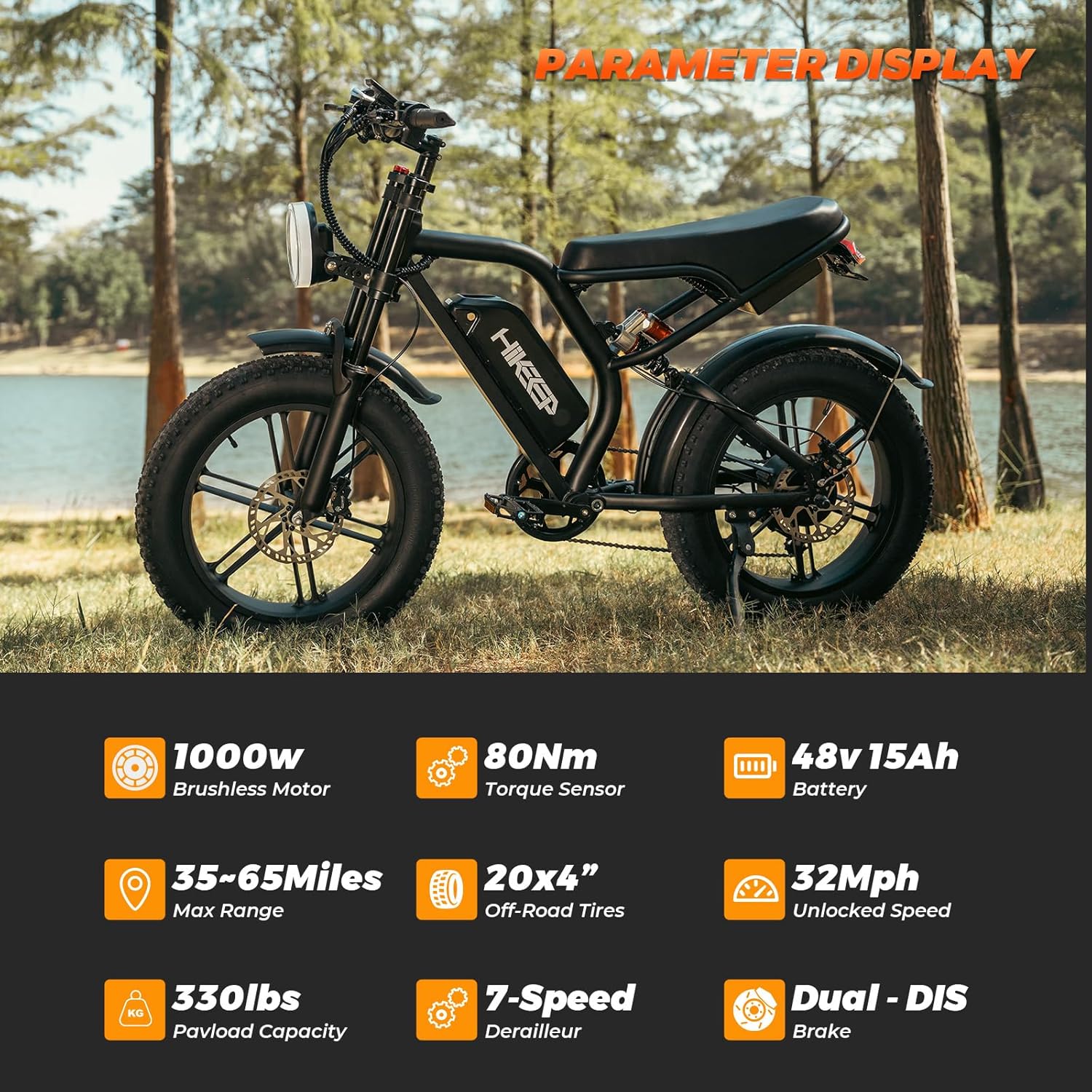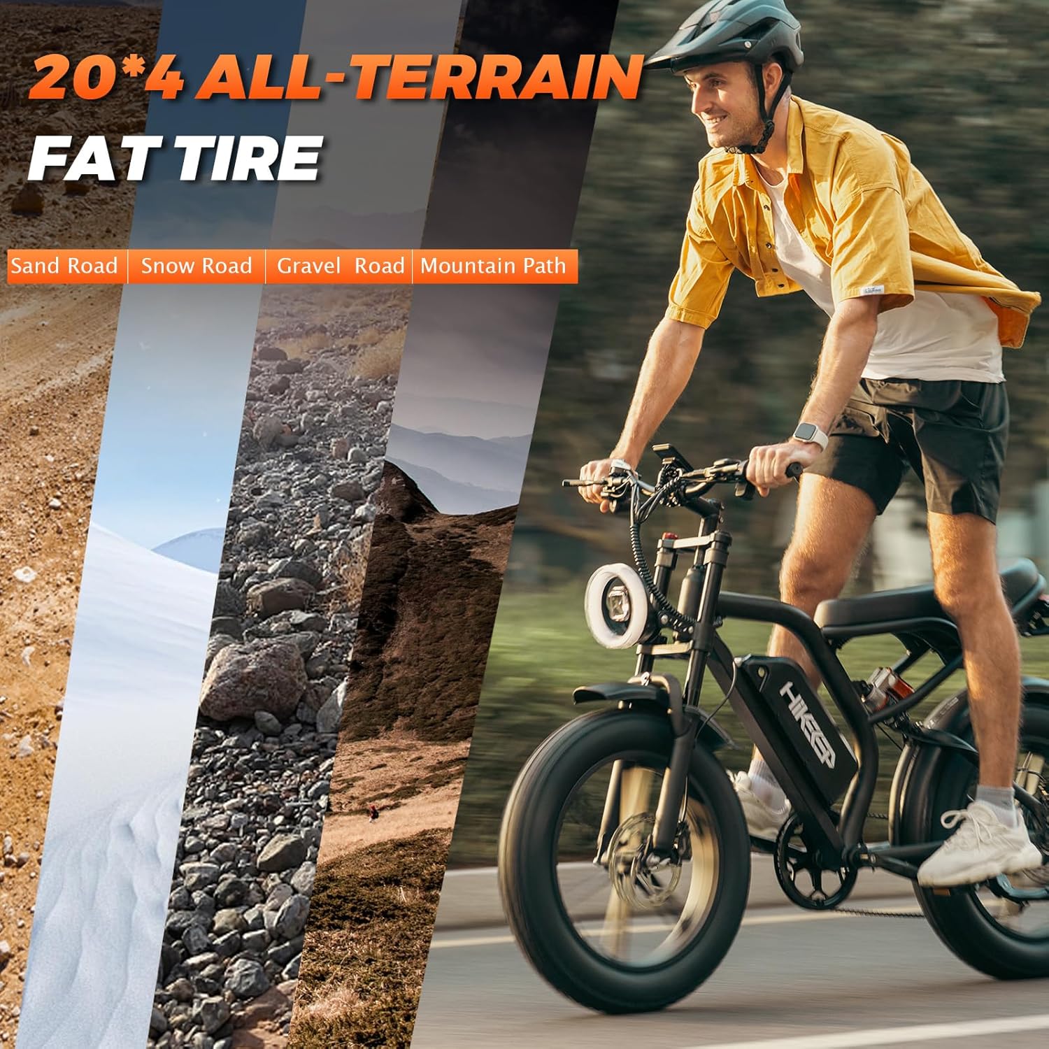 - __pgraded Electric Bike for Adult__he 1500W peak brushless hub motor and the battery of 48V/13AH offers enhanced climbing ability, reaching speeds of up to 30 mph in pure electric mode, effortlessly conquering gradients of up to 35 degrees. Two 20__ 4_ Fat tires puncture-resistant tires adapt to all terrain. Enjoy the speed and freedom.