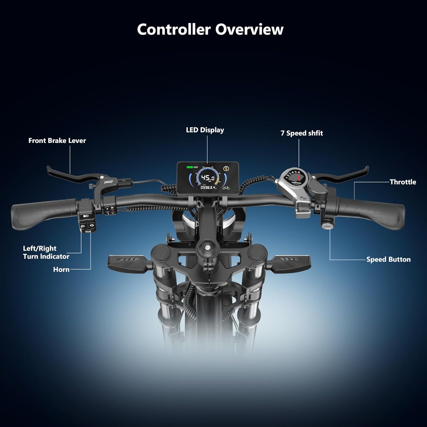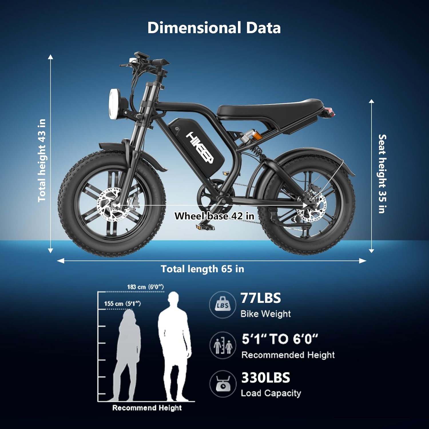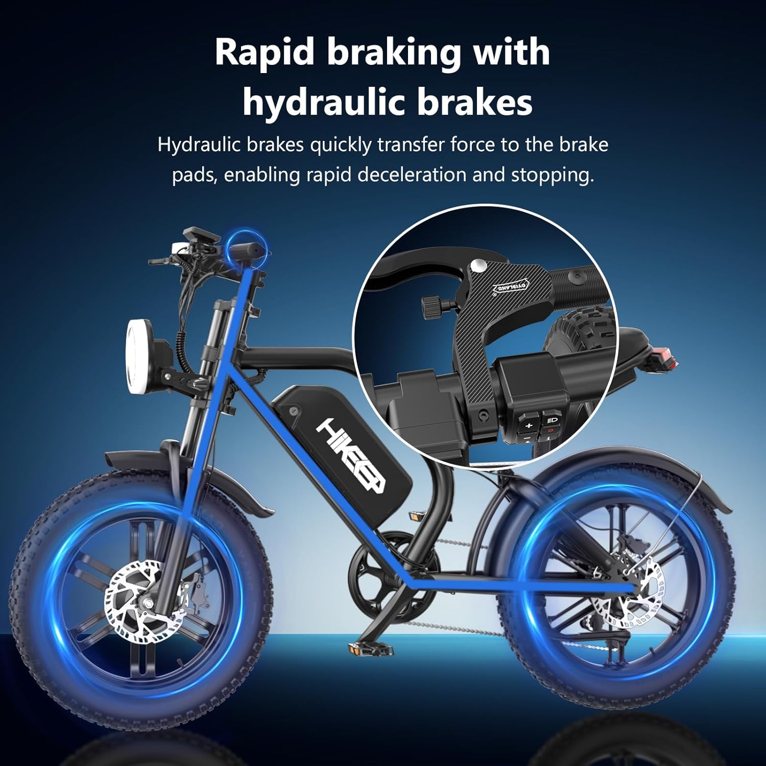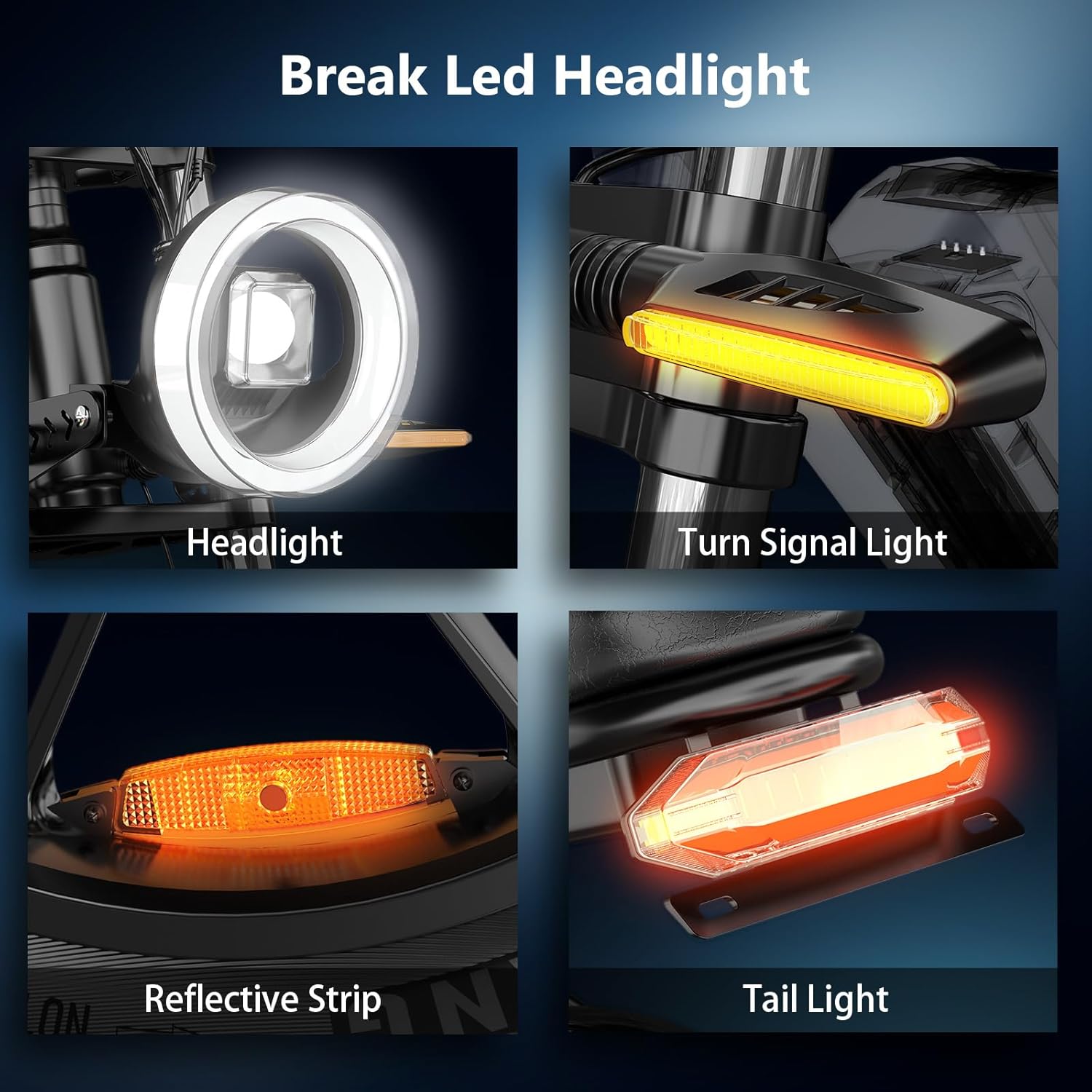 - __pgraded Electric Bike for Adult__he 1500W peak brushless hub motor and the battery of 48V/13AH offers enhanced climbing ability, reaching speeds of up to 30 mph in pure electric mode, effortlessly conquering gradients of up to 35 degrees. Two 20__ 4_ Fat tires puncture-resistant tires adapt to all terrain. Enjoy the speed and freedom.