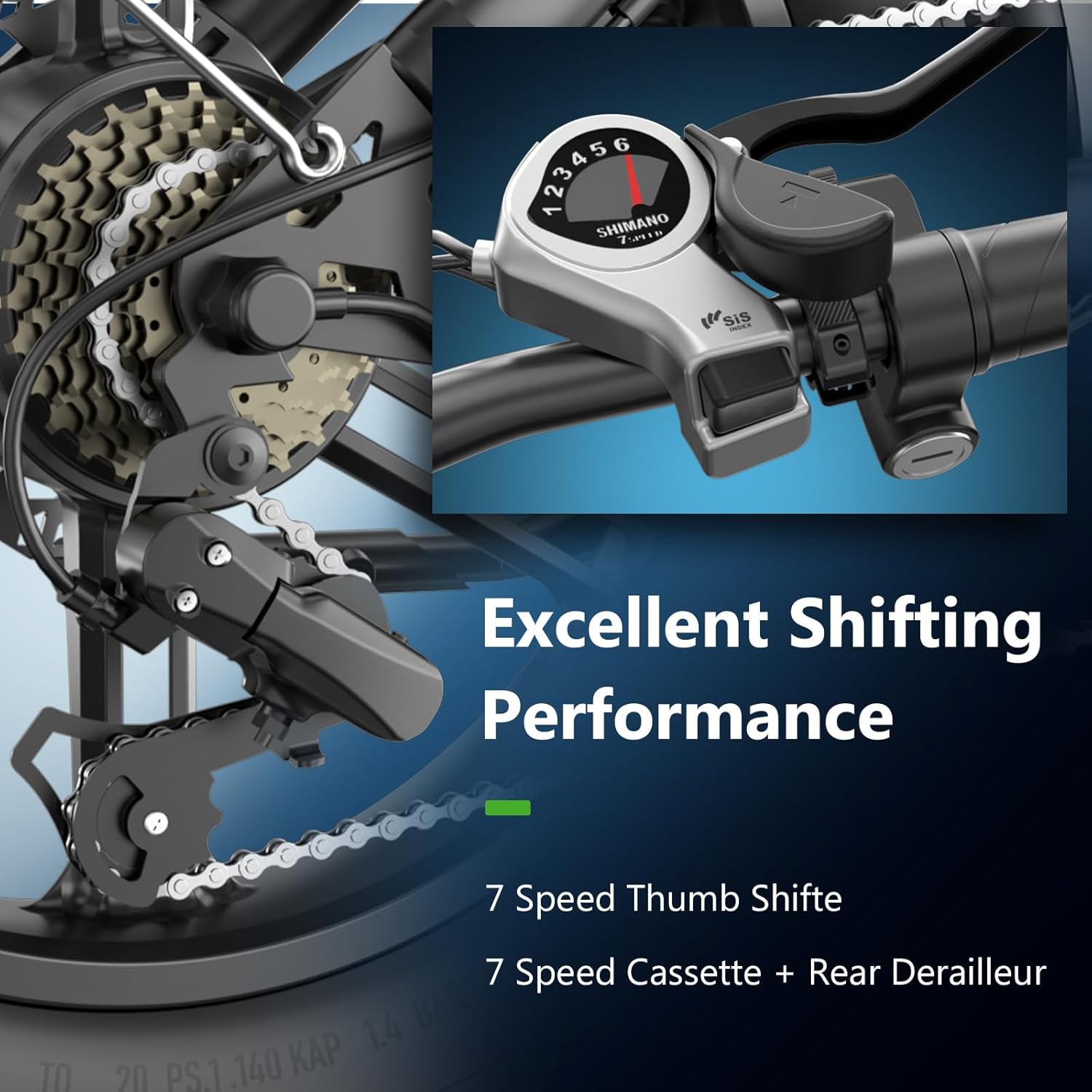 - _4 Modes+7-Speed__lectric mountain bikes for adults have 4 modes, including electric, pedal assist ,cruise mode and ordinary bicycle modes. You can choose modes based on your situation or preferences to achieve a safe, comfortable, healthy, and energy-efficient travel experience. The 7-Speed function allows you to easily navigate various terrains and complete exciting off-road trips with ease.
