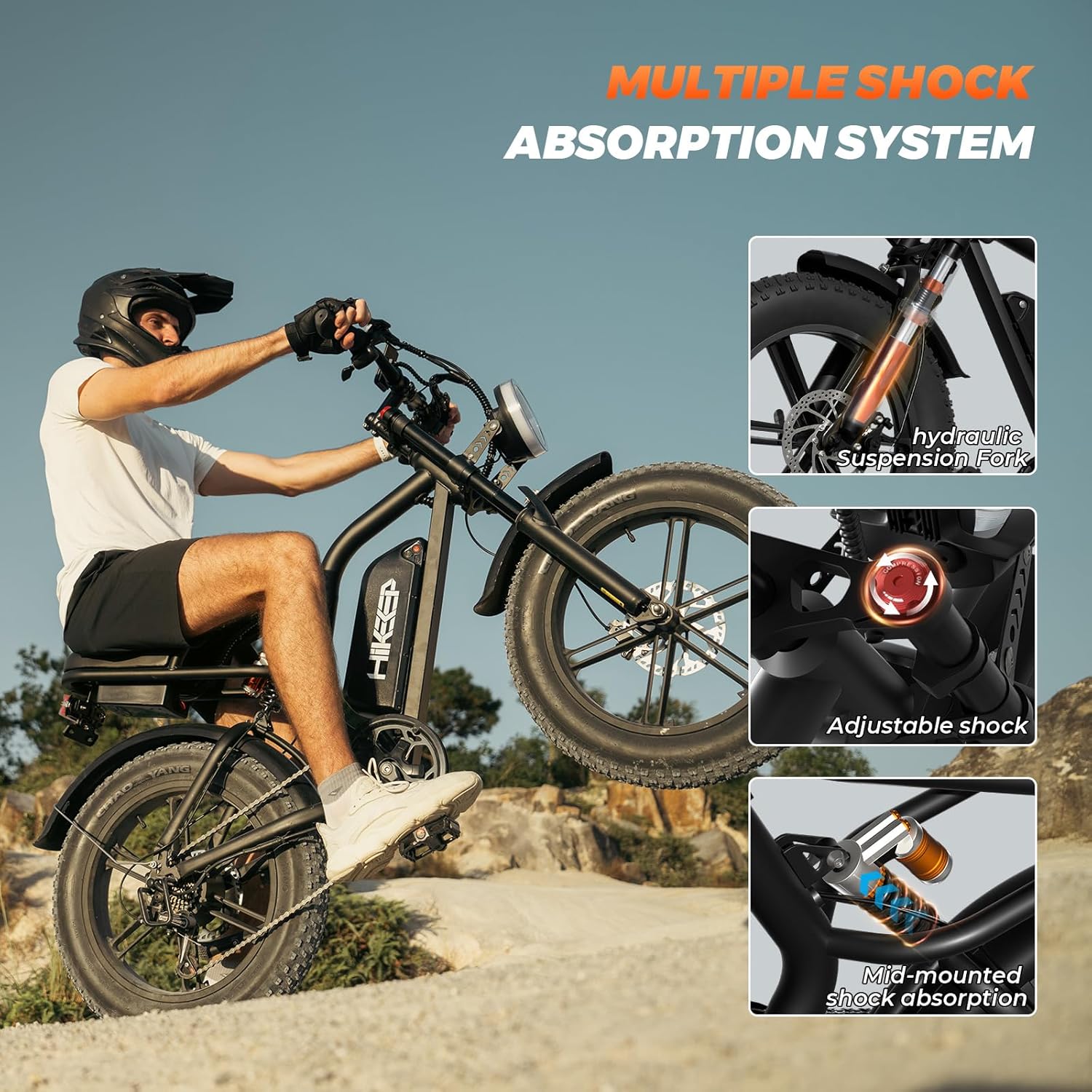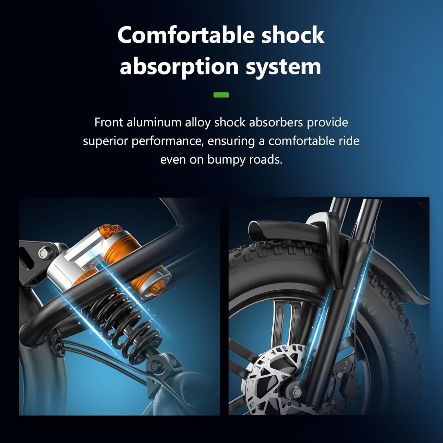 - __afety and Stability Dirt Electric Bike For Adult__he Electric Bike features a 5-stage full suspension system including two fork spring dampers, a seat spring damper and two 20 ' puncture-proof fat tires that absorb shocks and bumps. Conquer all terrains with confidence. Dual disc brake system reduces braking distance for safer and more reliable riding even in extreme weather conditions.