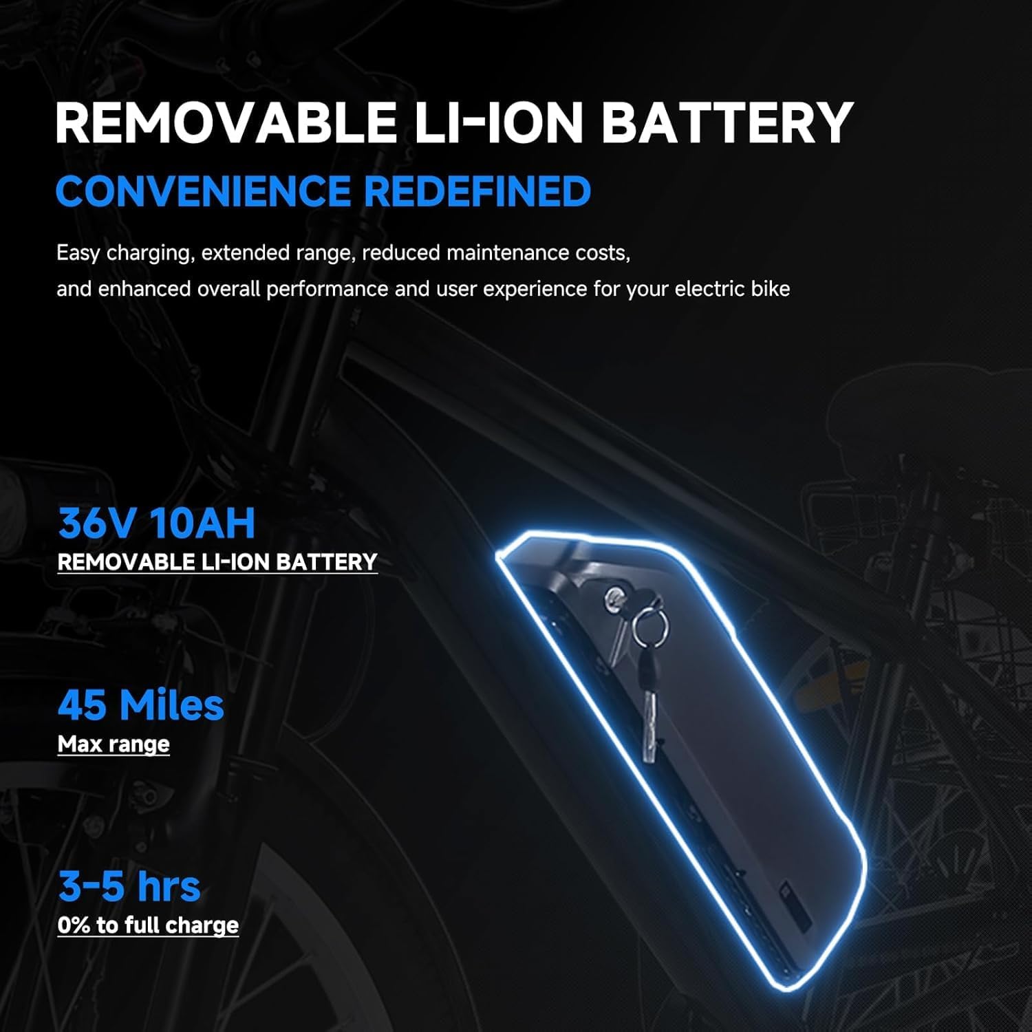 - _36V 10Ah Removable Battery & Extended Range_ Equipped with a 36V 10Ah lithium battery, this electric tricycle offers up to 45 miles on pure electric mode and 45 miles with pedal assist (PAS 1) on a single charge. The removable design allows for easy charging and storage, ensuring you have the power needed for daily commutes and outdoor adventures