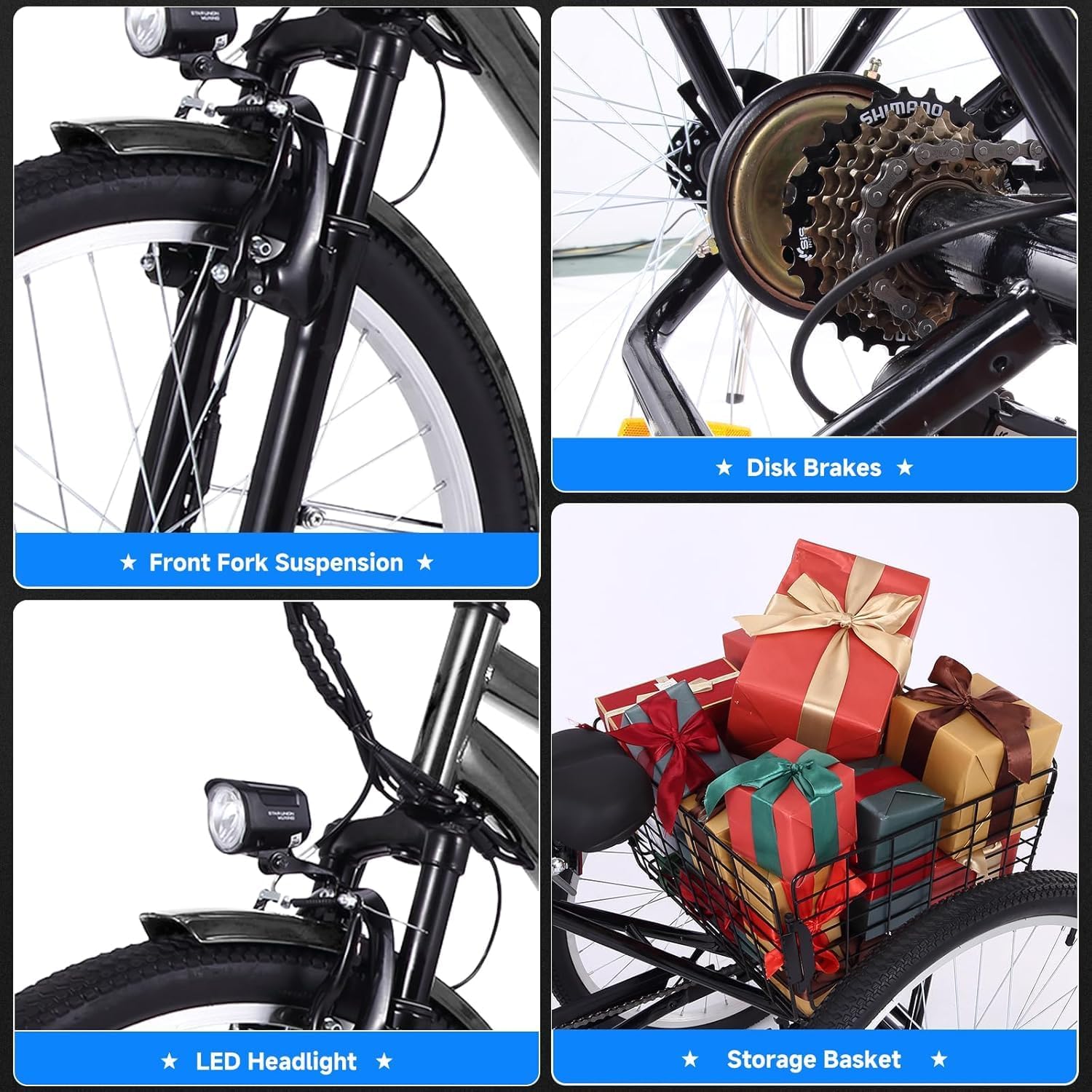 - __pacious & Removable Cargo Basket_ This adult electric tricycle features a large rear cargo basket that can be easily detached and used as a shopping basket. Whether you're grocery shopping, running errands, or carrying camping gear, this electric bicycle makes transporting heavy loads effortless. Enjoy enhanced convenience and functionality with this innovative e-trike