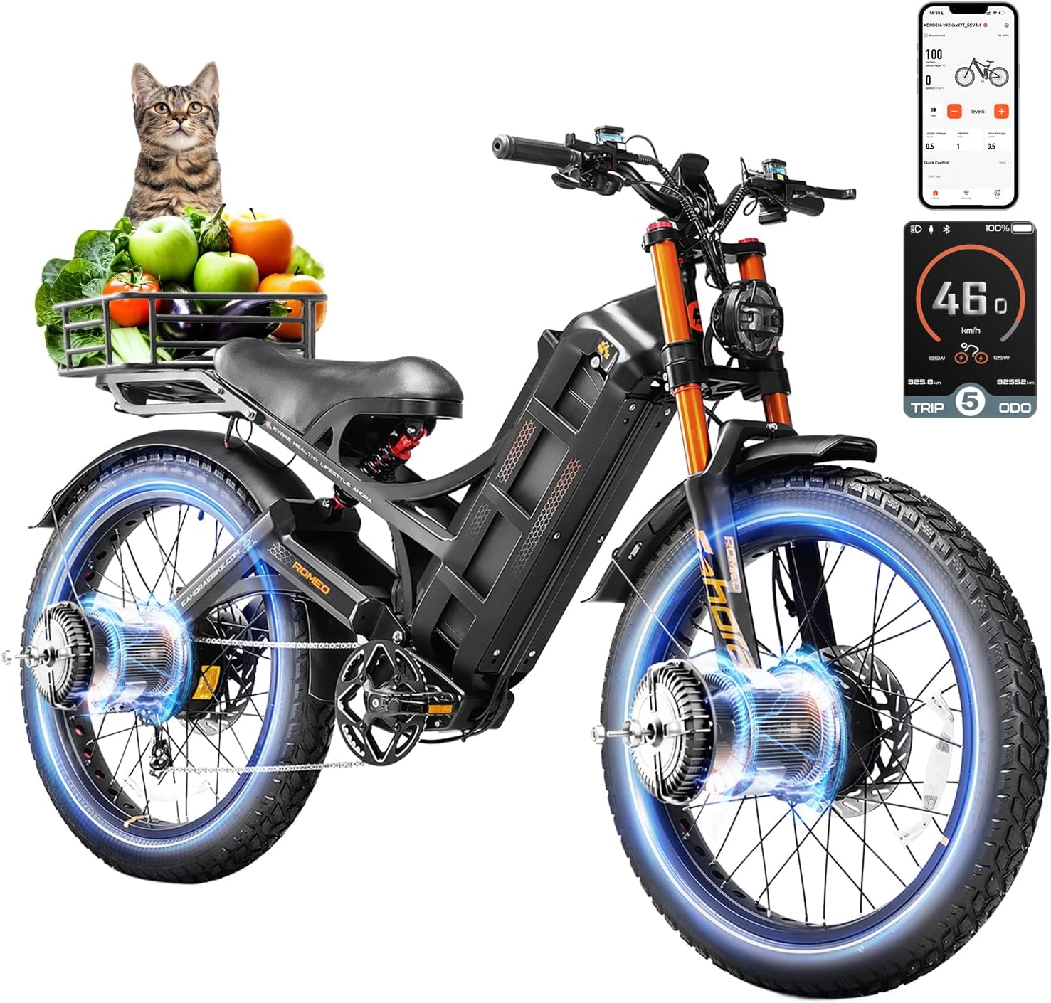- __PGRADED 46MPH DUAL MOTOR__Ahora Romeo Pro II adopts 4000W high-speed dual motor, providing better acceleration & strong climbing power in 2.5 second, top speed up to 46MPH in pedal assist mode. _ The dual motors offer better weight distribution and power balance across both wheels, avoiding the need for either motor to consume excessive power, helps conserve battery life.